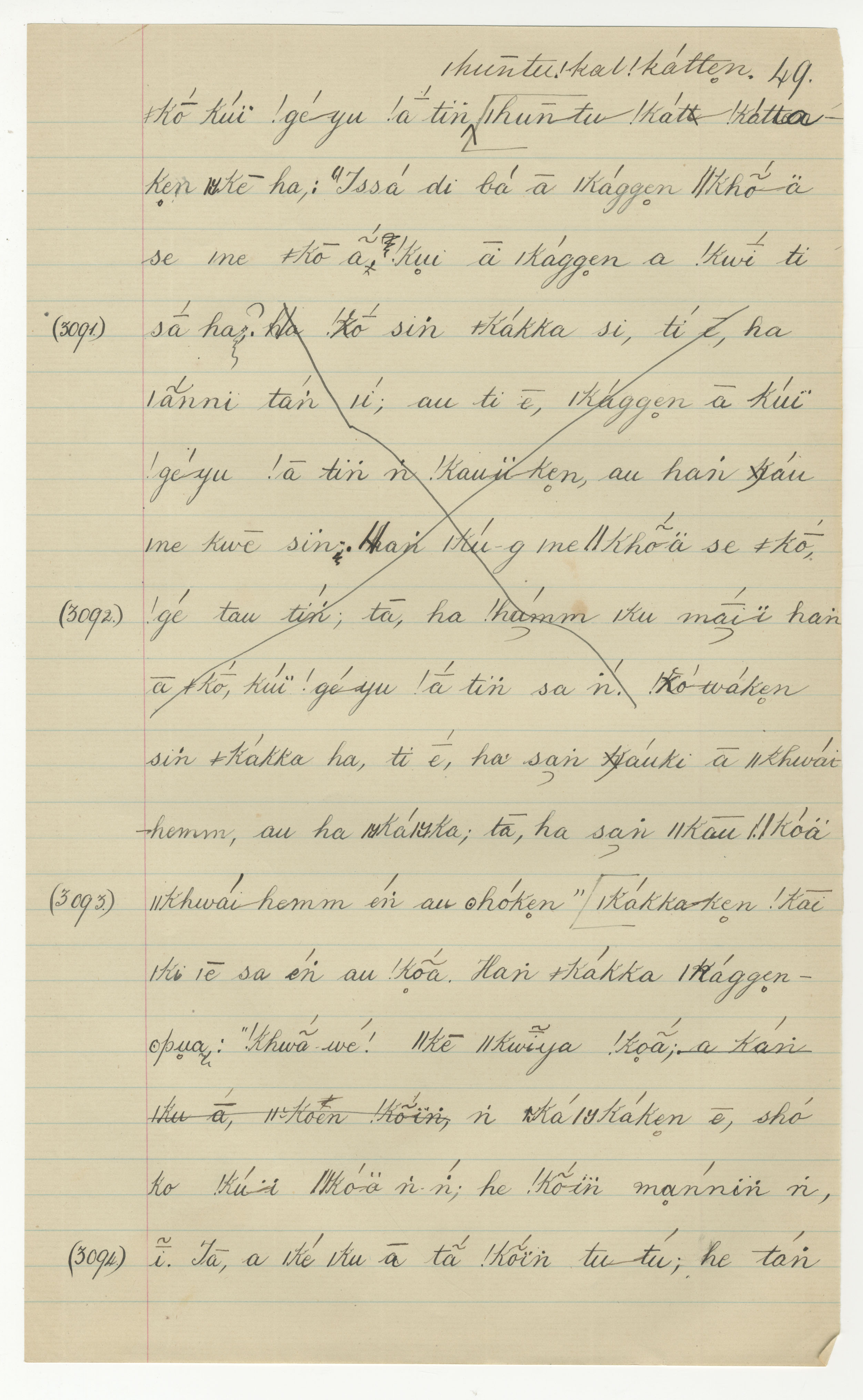 Manuscript page taken from ǁkabbo's story, The Mantis takes away the Tick's sheep (including Porcupine's speech concerning the coming of ǁkhwai-hemm) -- in Lloyd notebook 34 (dated 1873), pages (continuing from) 3090 to 3094.