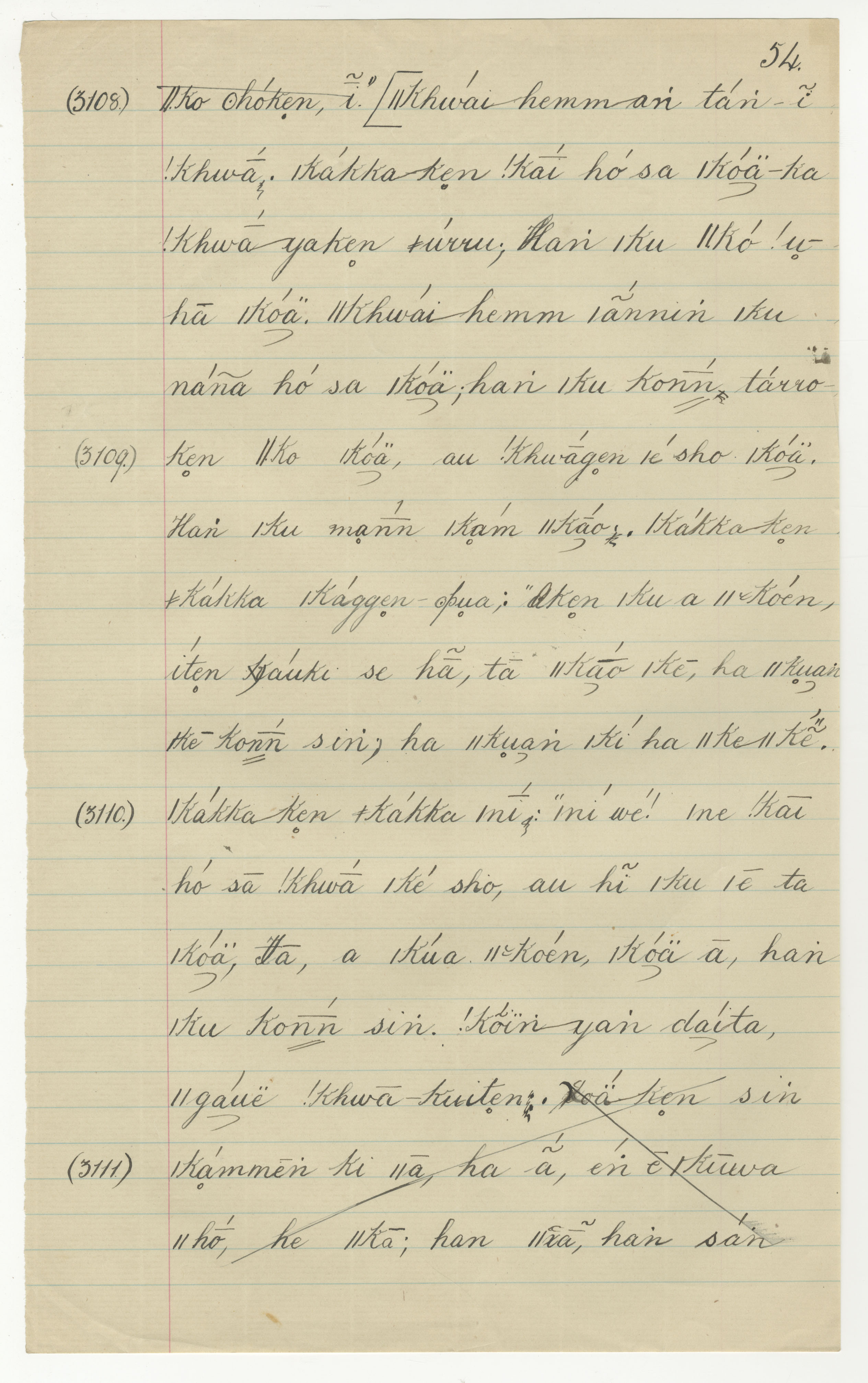 Manuscript page taken from ǁkabbo's story, The Mantis takes away the Tick's sheep (including Porcupine's speech concerning the coming of ǁkhwai-hemm) -- in Lloyd notebook 34 (dated 1873), pages 3108 to 3111.