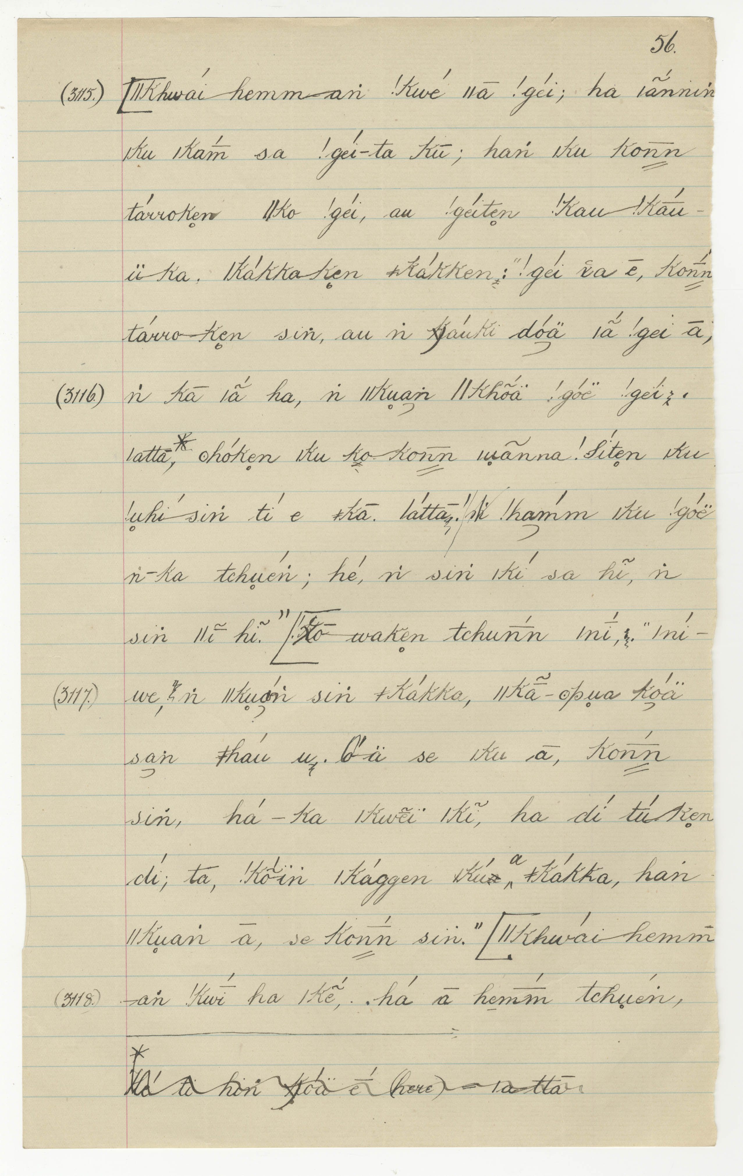 Manuscript page taken from ǁkabbo's story, The Mantis takes away the Tick's sheep (including Porcupine's speech concerning the coming of ǁkhwai-hemm) -- in Lloyd notebook 34 (dated 1873), pages 3115 to 3118.