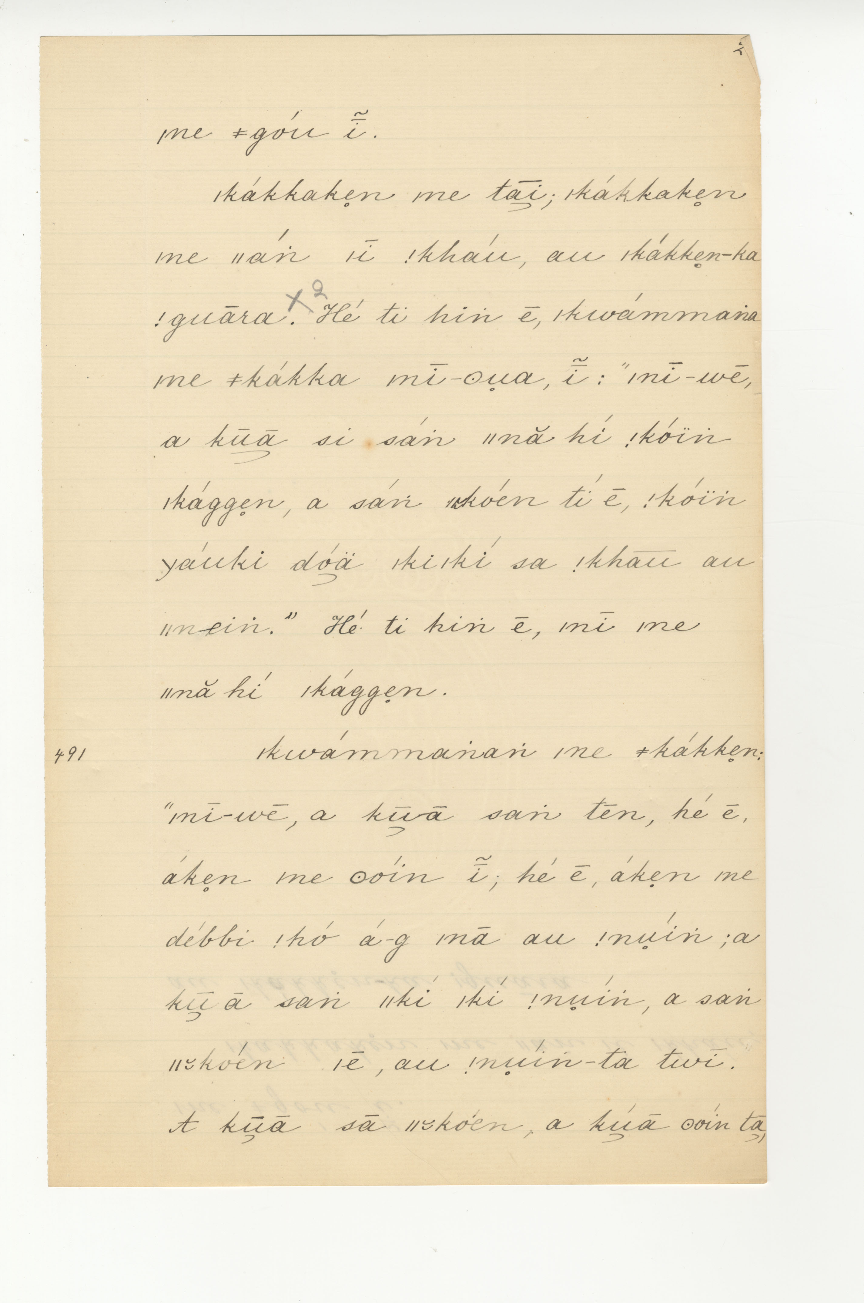 Manuscript page taken from ǁkabbo's story, The |kaggen who took |kammanga's shoe, and turned it into an eland -- in Lloyd notebook 4 (dated 1871), page 491.