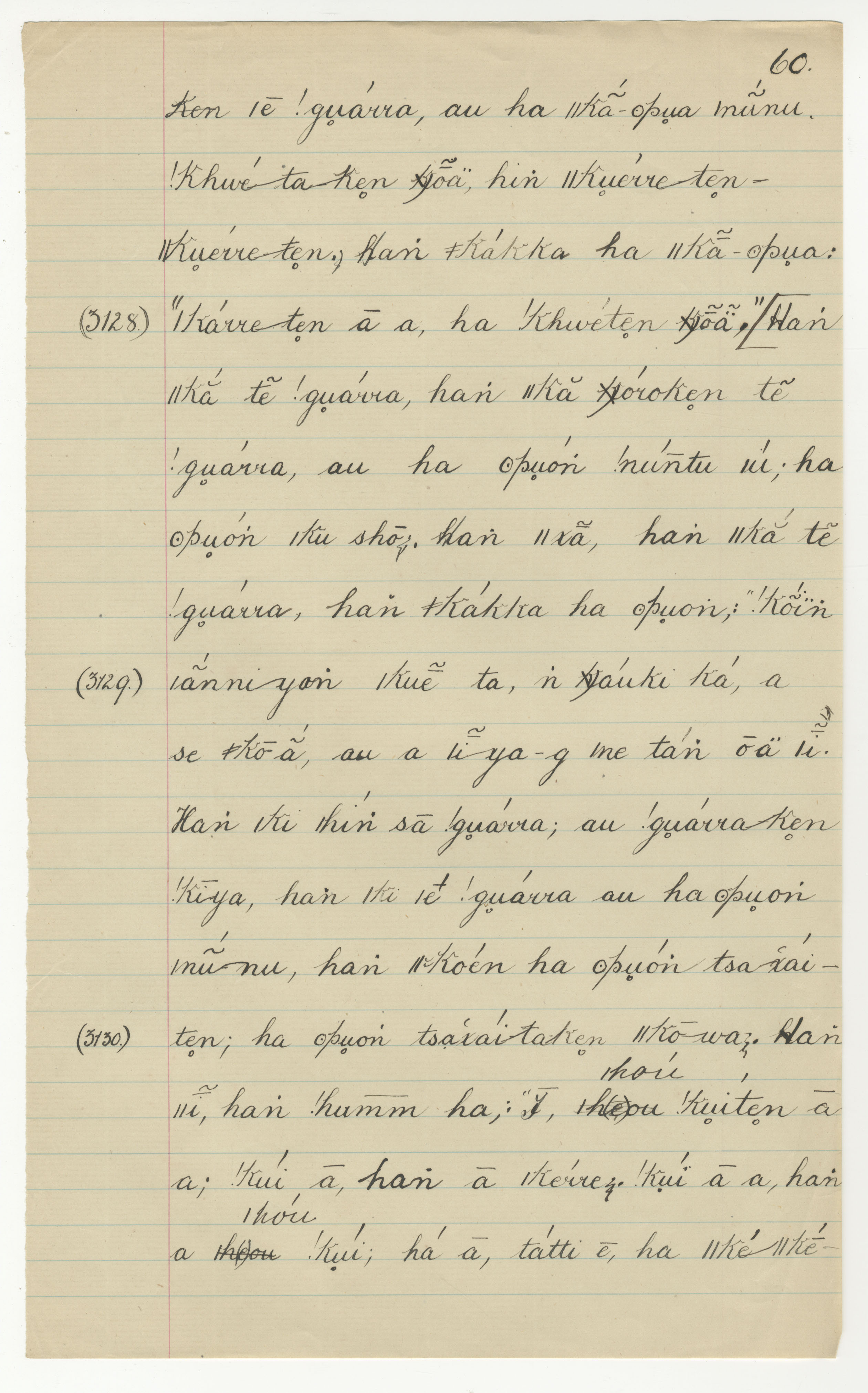 Manuscript page taken from ǁkabbo's story, The Mantis takes away the Tick's sheep (including Porcupine's speech concerning the coming of ǁkhwai-hemm) -- in Lloyd notebook 34 (dated 1873), pages (continuing from) 3127 to 3130.