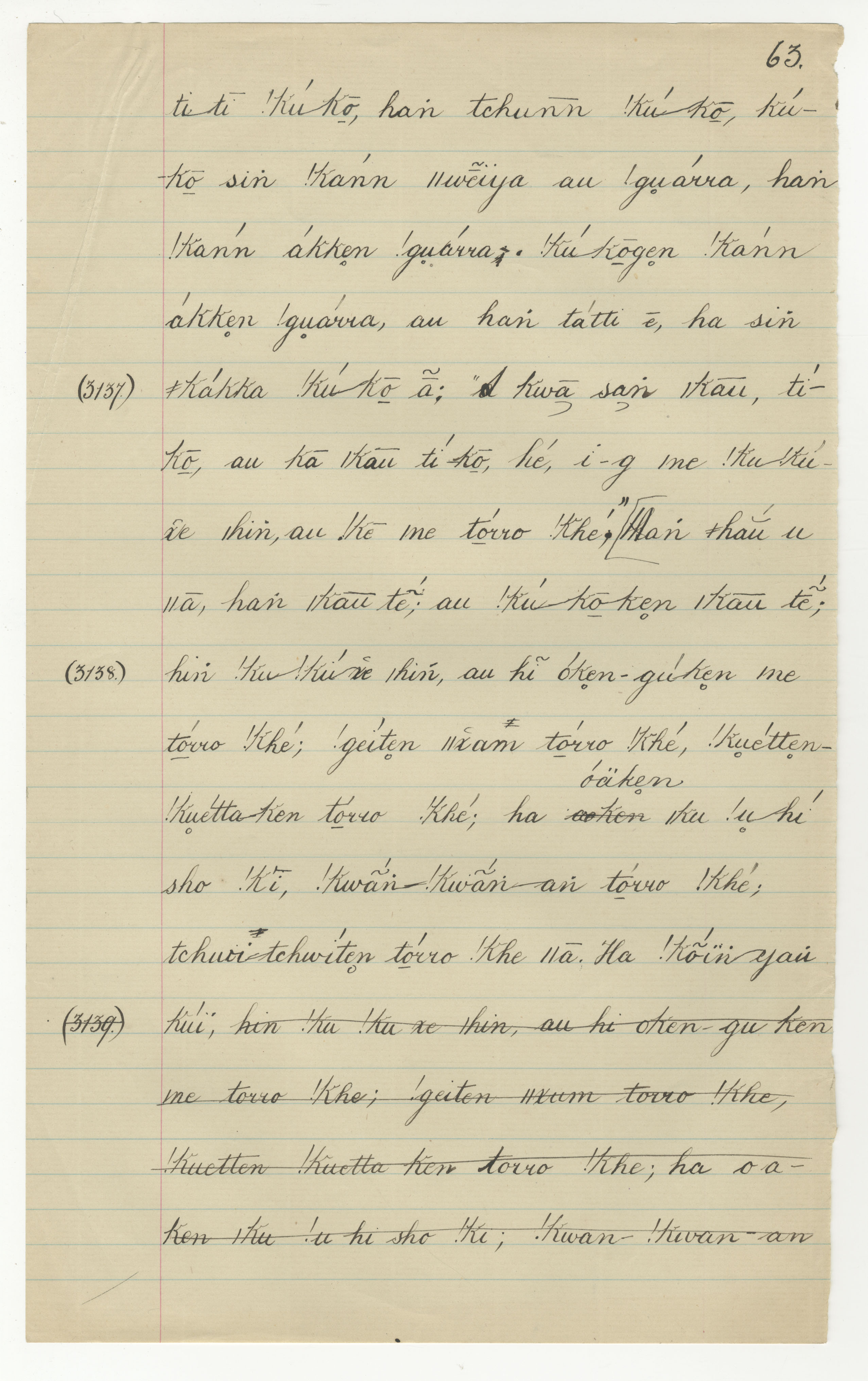 Manuscript page 63, taken from ǁkabbo's story, The Mantis takes away the Tick's sheep (including Porcupine's speech concerning the coming of ǁkhwai-hemm) -- in Lloyd notebook 34 (dated 1873), pages (continuing from) 3136 to 3139 (with the number cancelled).