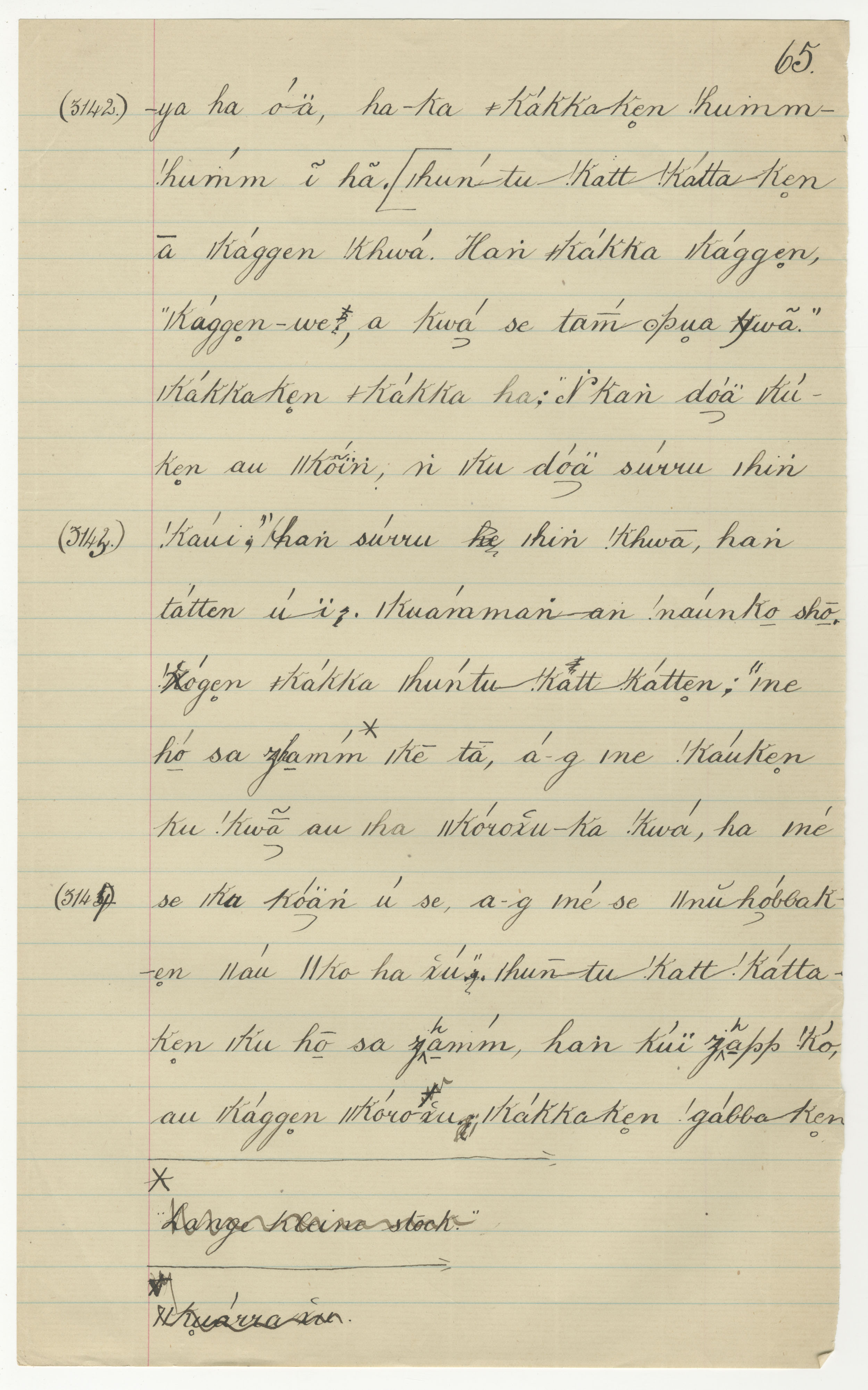 Manuscript page 65, taken from ǁkabbo's story, The Mantis takes away the Tick's sheep (including Porcupine's speech concerning the coming of ǁkhwai-hemm) -- in Lloyd notebook 34 (dated 1873), pages (continuing from) 3142 to 3144.