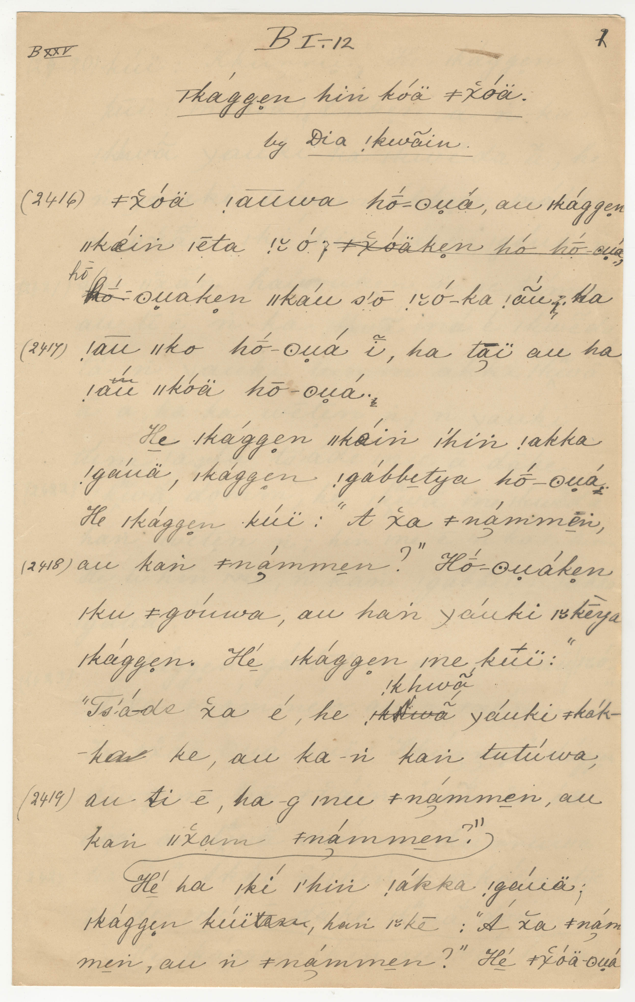 Manuscript page 1, taken from Dia!kwain's story, How an Elephant steals a young Springbok from |kaggen (the Mantis) or Pet Springbok carried off by an Elephant, in Bleek notebook 25 (dated 1874 [started]), page 2416 to 2419.