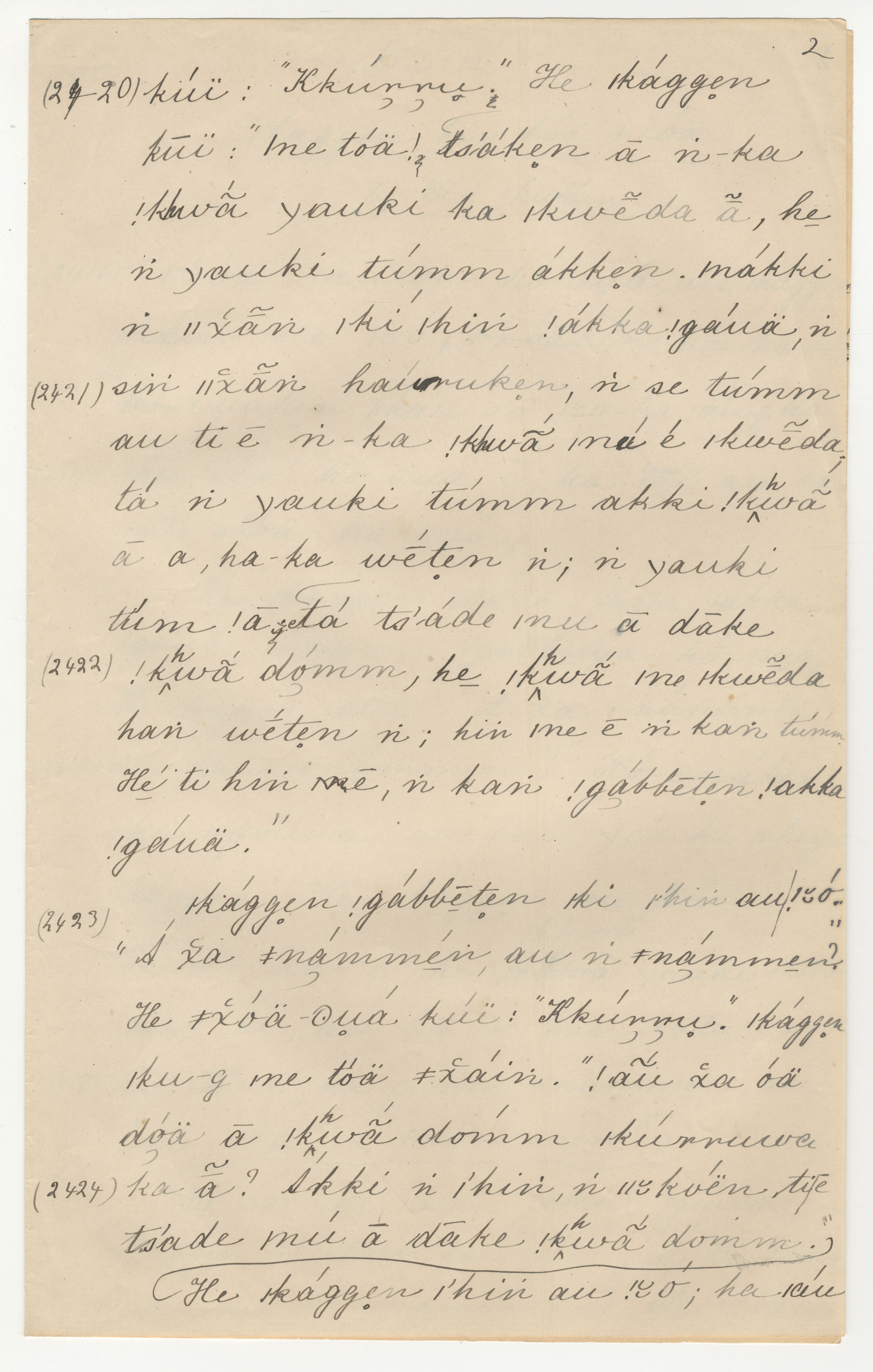 Manuscript page 2, taken from Dia!kwain's story, How an Elephant steals a young Springbok from |kaggen (the Mantis) or Pet Springbok carried off by an Elephant, in Bleek notebook 25 (dated 1874 [started]), page 2420 to 2424.