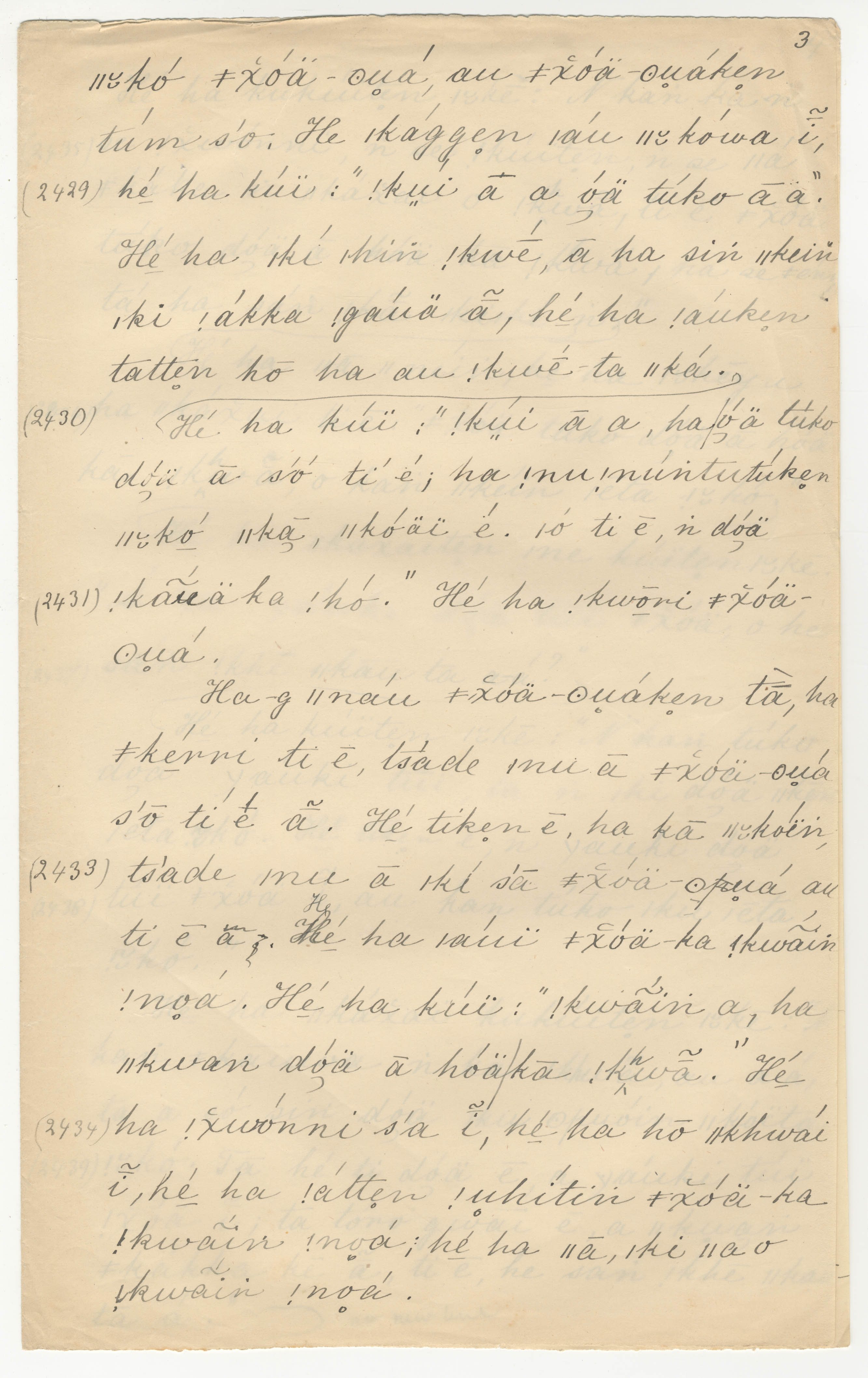 Manuscript page 3, taken from Dia!kwain's story, How an Elephant steals a young Springbok from |kaggen (the Mantis) or Pet Springbok carried off by an Elephant, in Bleek notebook 25 (dated 1874 [started]), pages (continuing from) 2428 to 2434.