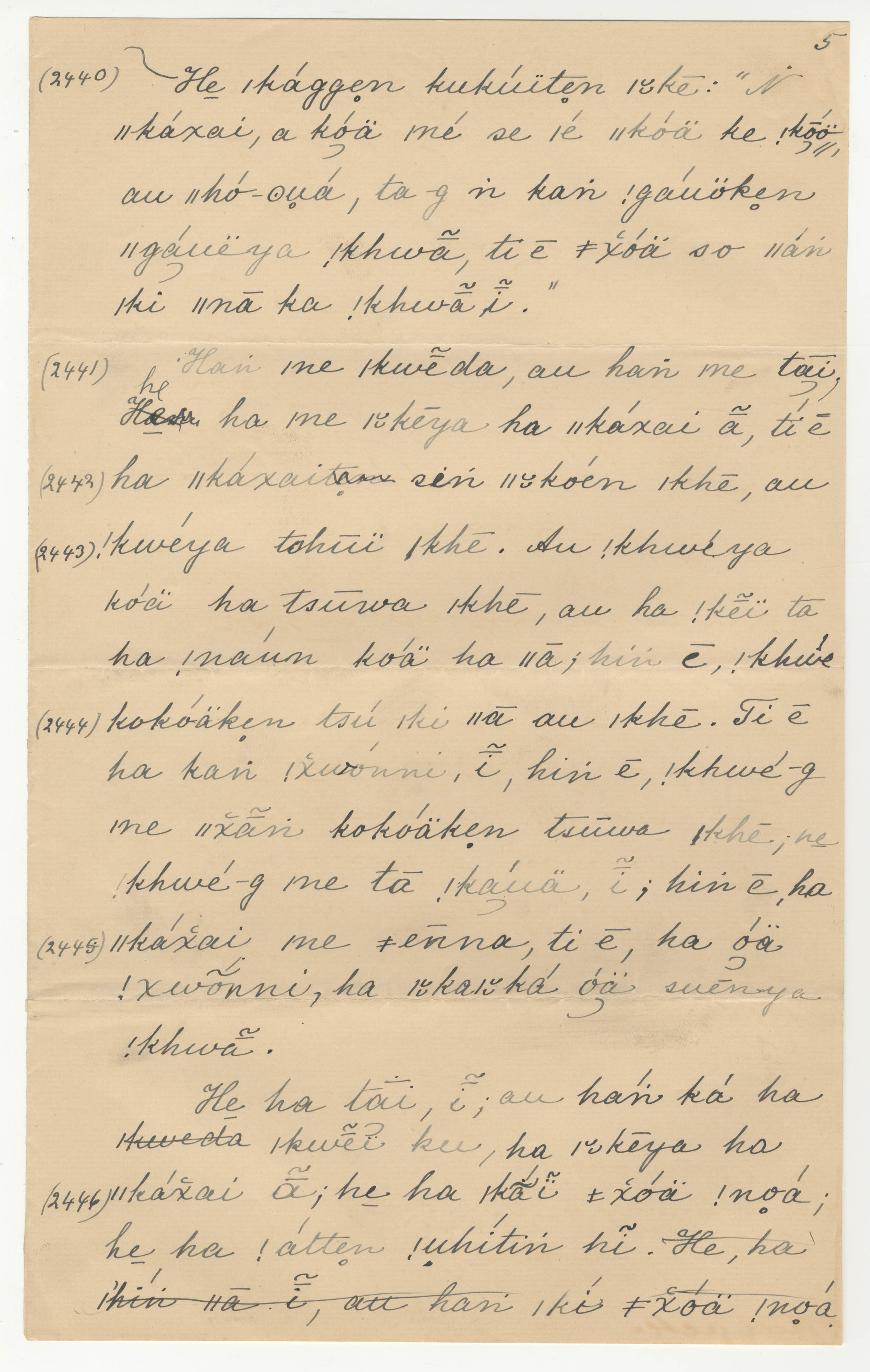 Manuscript page 5, taken from Dia!kwain's story, How an Elephant steals a young Springbok from |kaggen (the Mantis) or Pet Springbok carried off by an Elephant, in Bleek notebook 25 (dated 1874 [started]), pages 2440 to 2446.