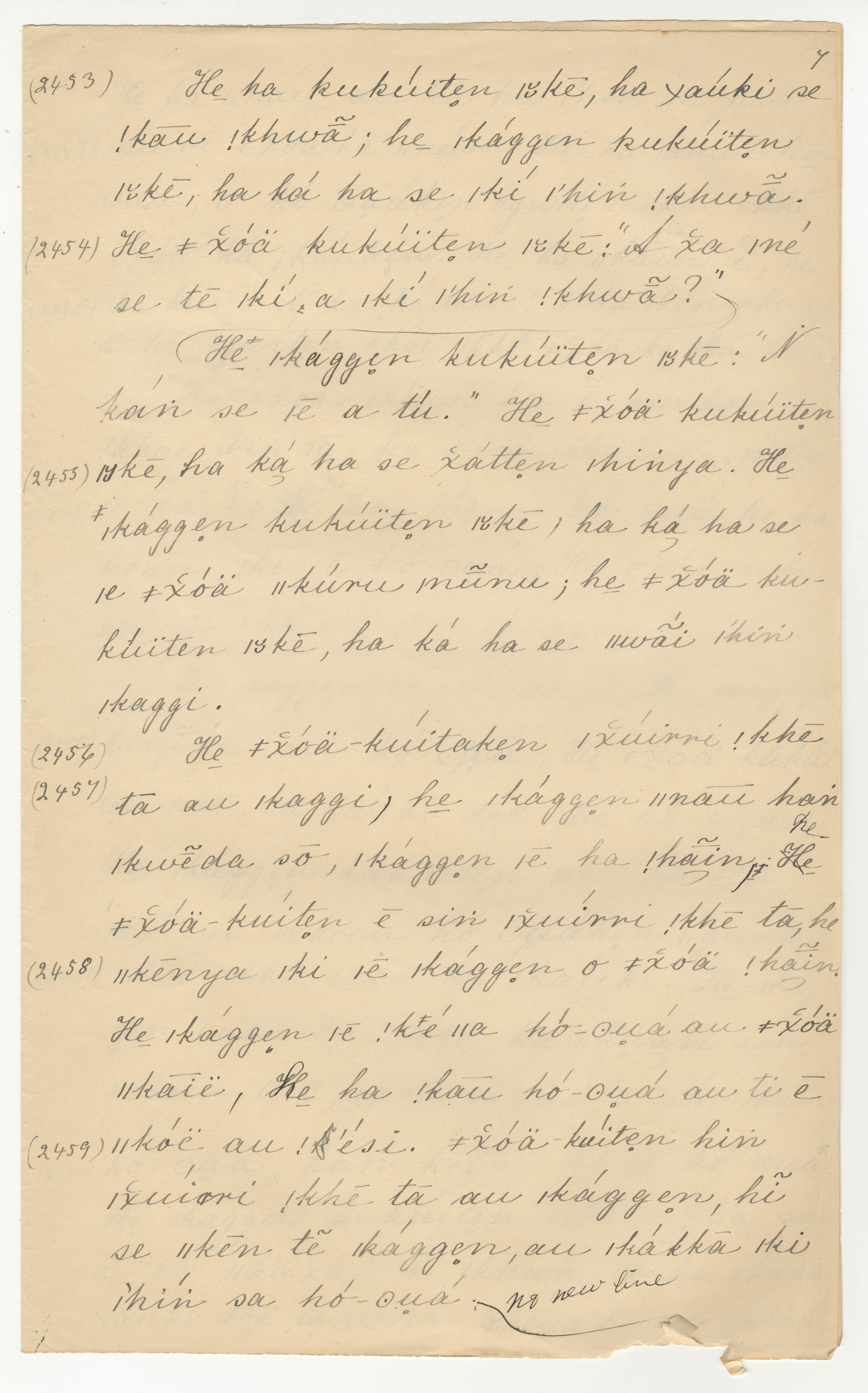 Manuscript page 7, taken from Dia!kwain's story, How an Elephant steals a young Springbok from |kaggen (the Mantis) or Pet Springbok carried off by an Elephant, in Bleek notebook 25 (dated 1874 [started]), pages 2453 to 2459.