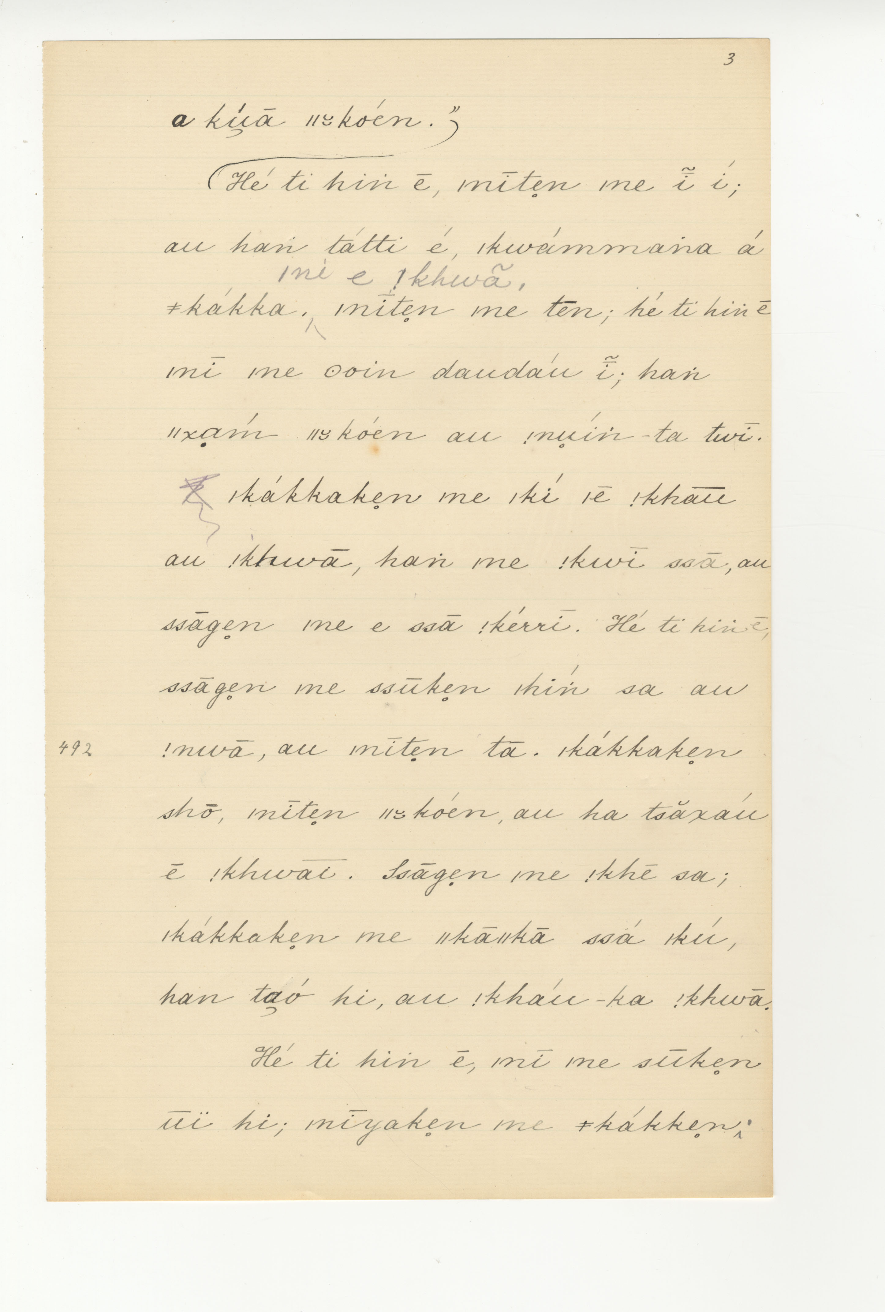 Manuscript page taken from ǁkabbo's story, The |kaggen who took |kammanga's shoe, and turned it into an eland -- in Lloyd notebook 4 (dated 1871), pages (continuing from) 491 to 492.