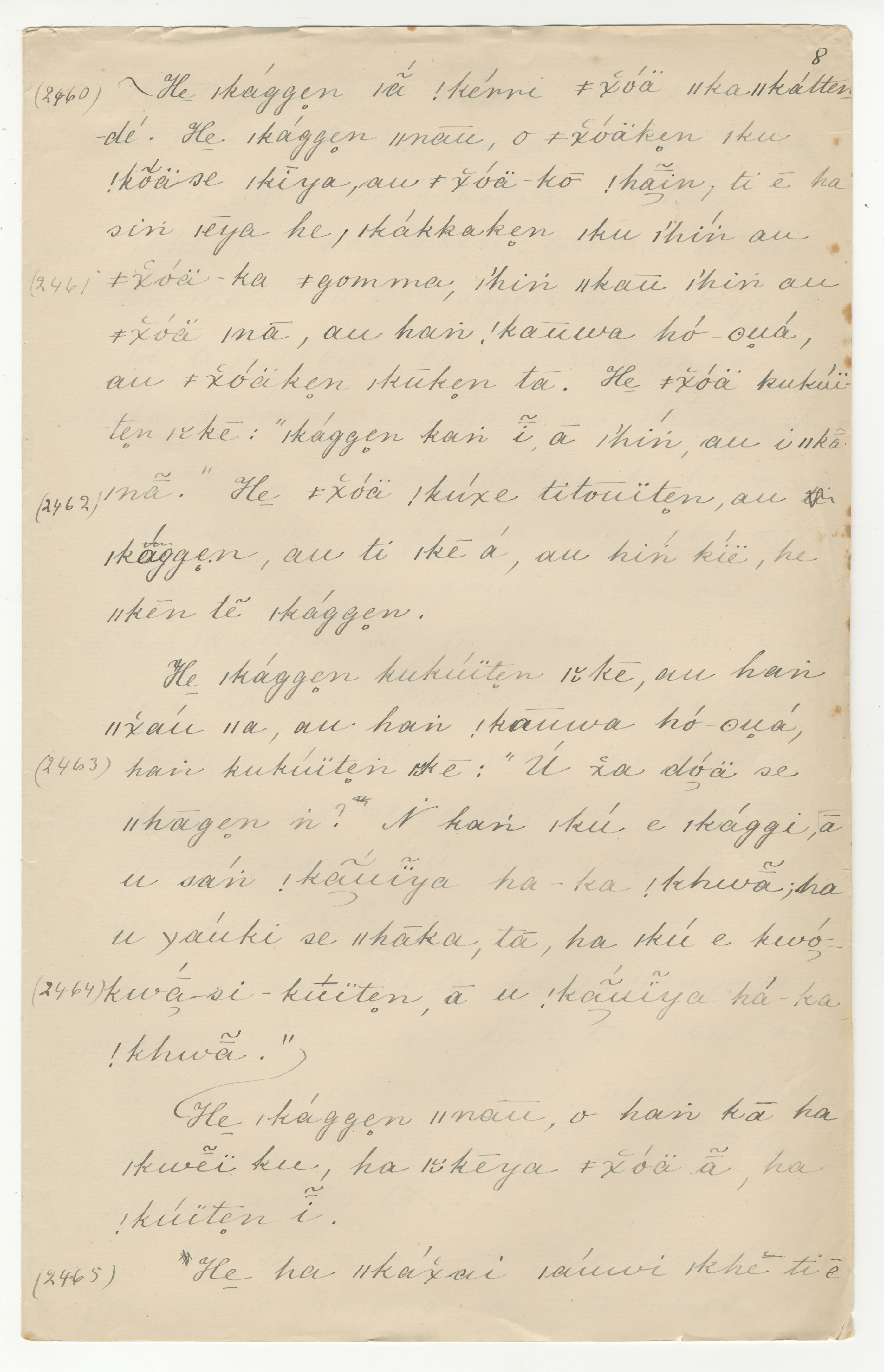 Manuscript page 8, taken from Dia!kwain's story, How an Elephant steals a young Springbok from |kaggen (the Mantis) or Pet Springbok carried off by an Elephant, in Bleek notebook 25 (dated 1874 [started]), pages 2460 to 2465.