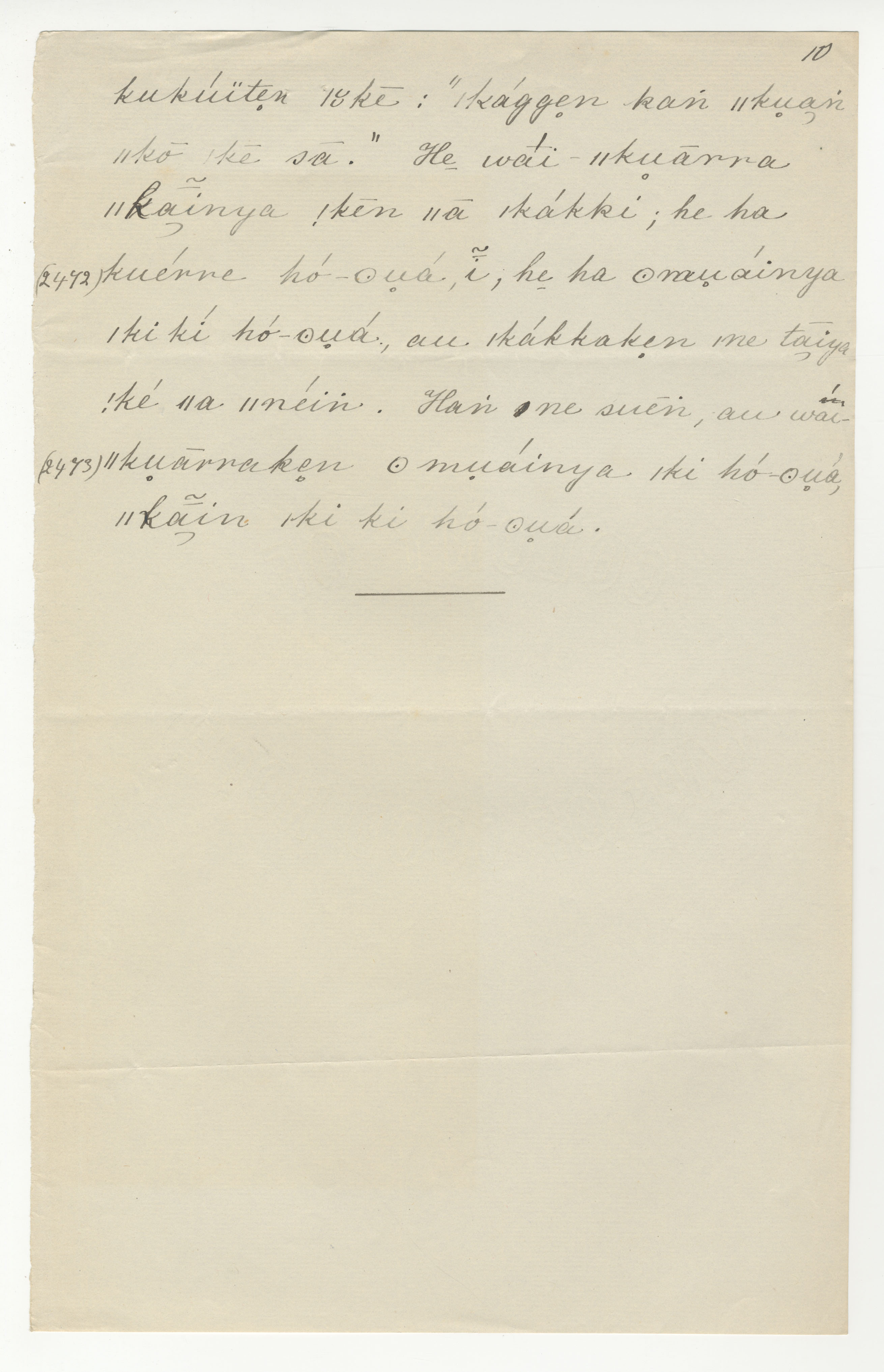Manuscript page 10, taken from Dia!kwain's story, How an Elephant steals a young Springbok from |kaggen (the Mantis) or Pet Springbok carried off by an Elephant, in Bleek notebook 25 (dated 1874 [started]), pages (continuing from) 2471 to 2473.