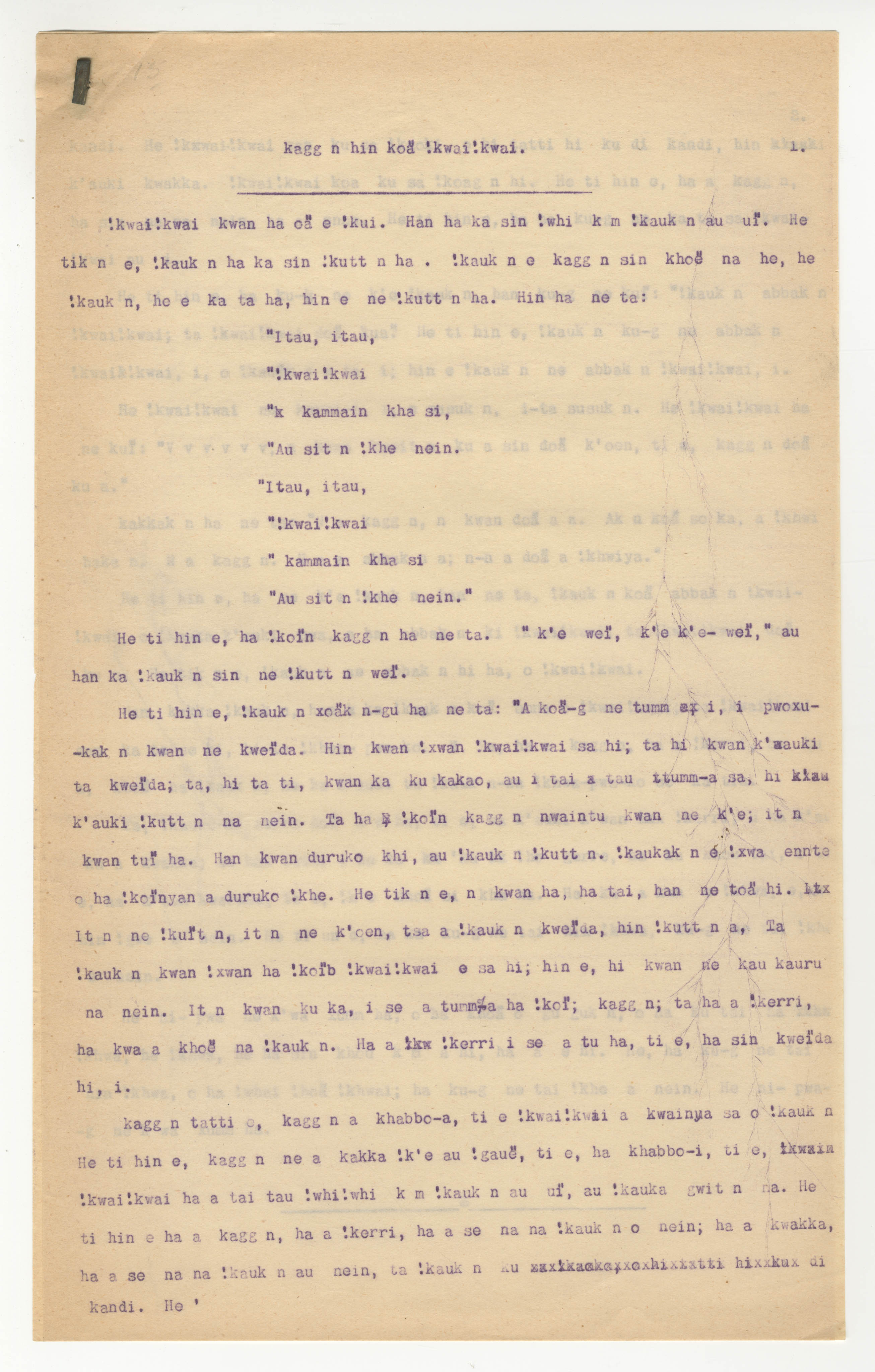 Manuscript page 1, taken from |han≠kass'o's story, The !kwai !kwai, the Mantis and the children -- in Lloyd notebook 3 (dated 1878 [started]).
