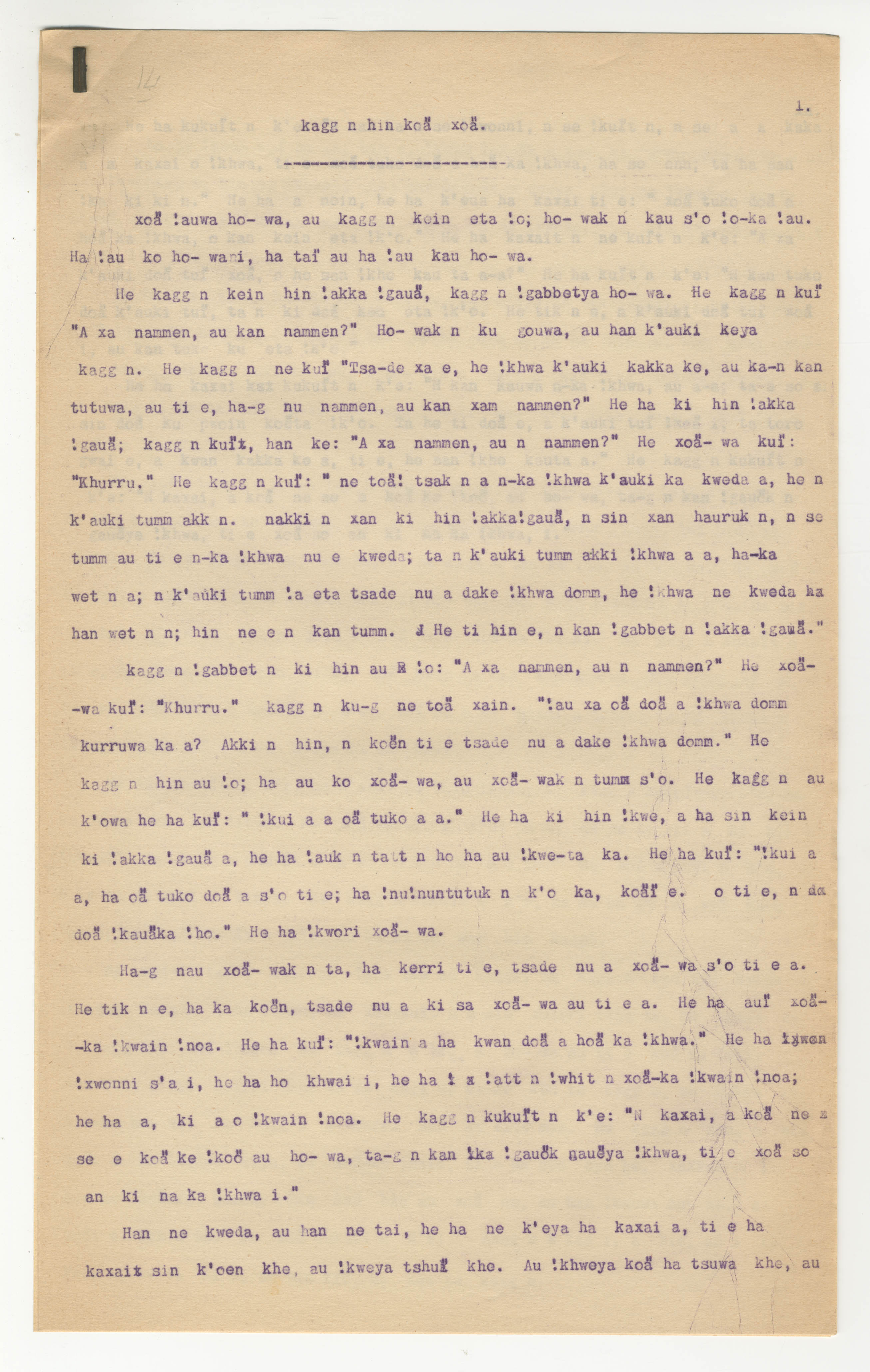 Manuscript page 1, taken from Dia!kwain's story, How an Elephant steals a young Springbok from |kaggen (the Mantis) or Pet Springbok carried off by an Elephant, in Bleek notebook 25 (dated 1874 [started]). Source page(s) unspecified in this iteration.