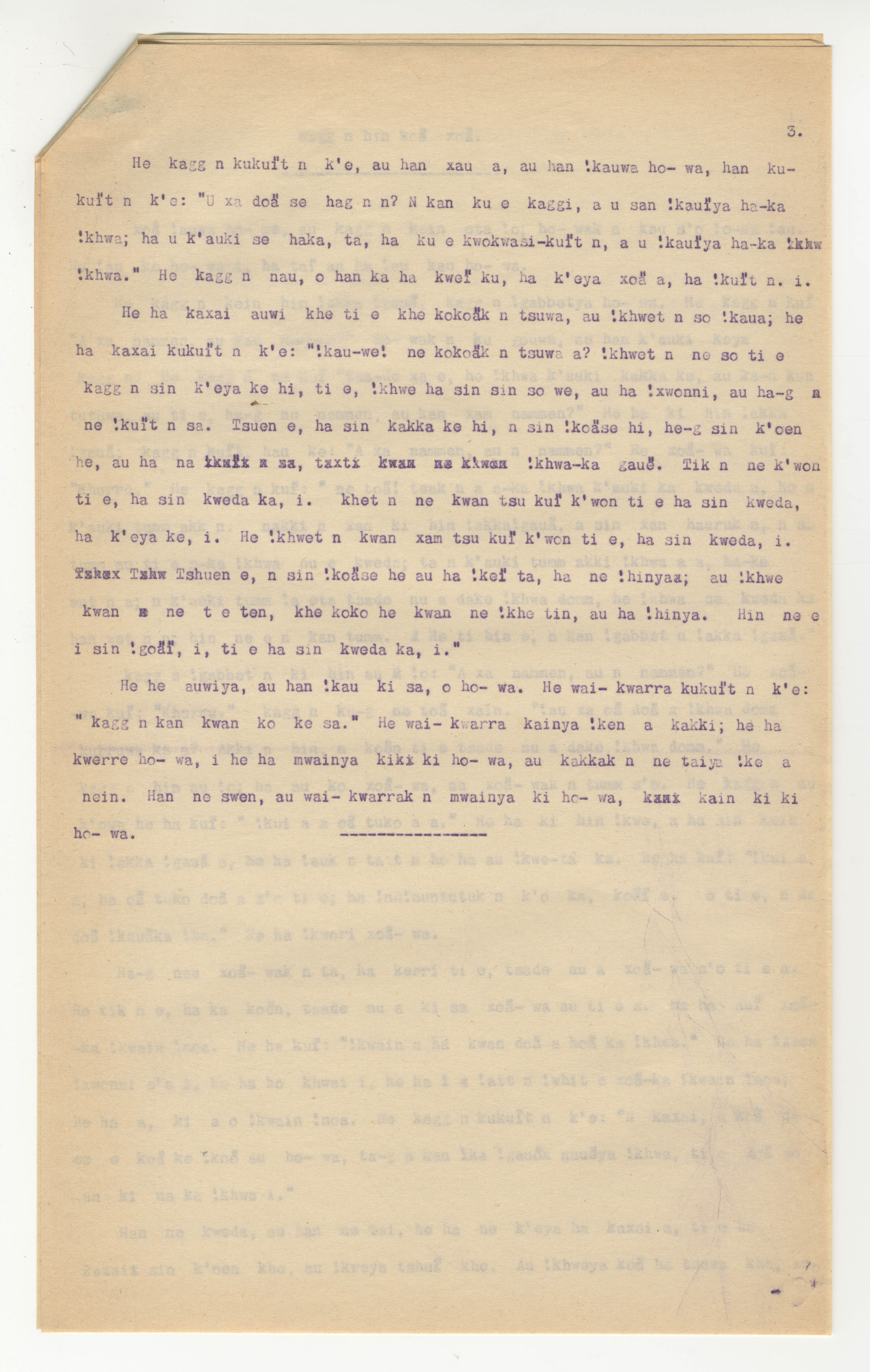 Manuscript page 3, taken from Dia!kwain's story, How an Elephant steals a young Springbok from |kaggen (the Mantis) or Pet Springbok carried off by an Elephant, in Bleek notebook 25 (dated 1874 [started]). Source page(s) unspecified in this iteration.