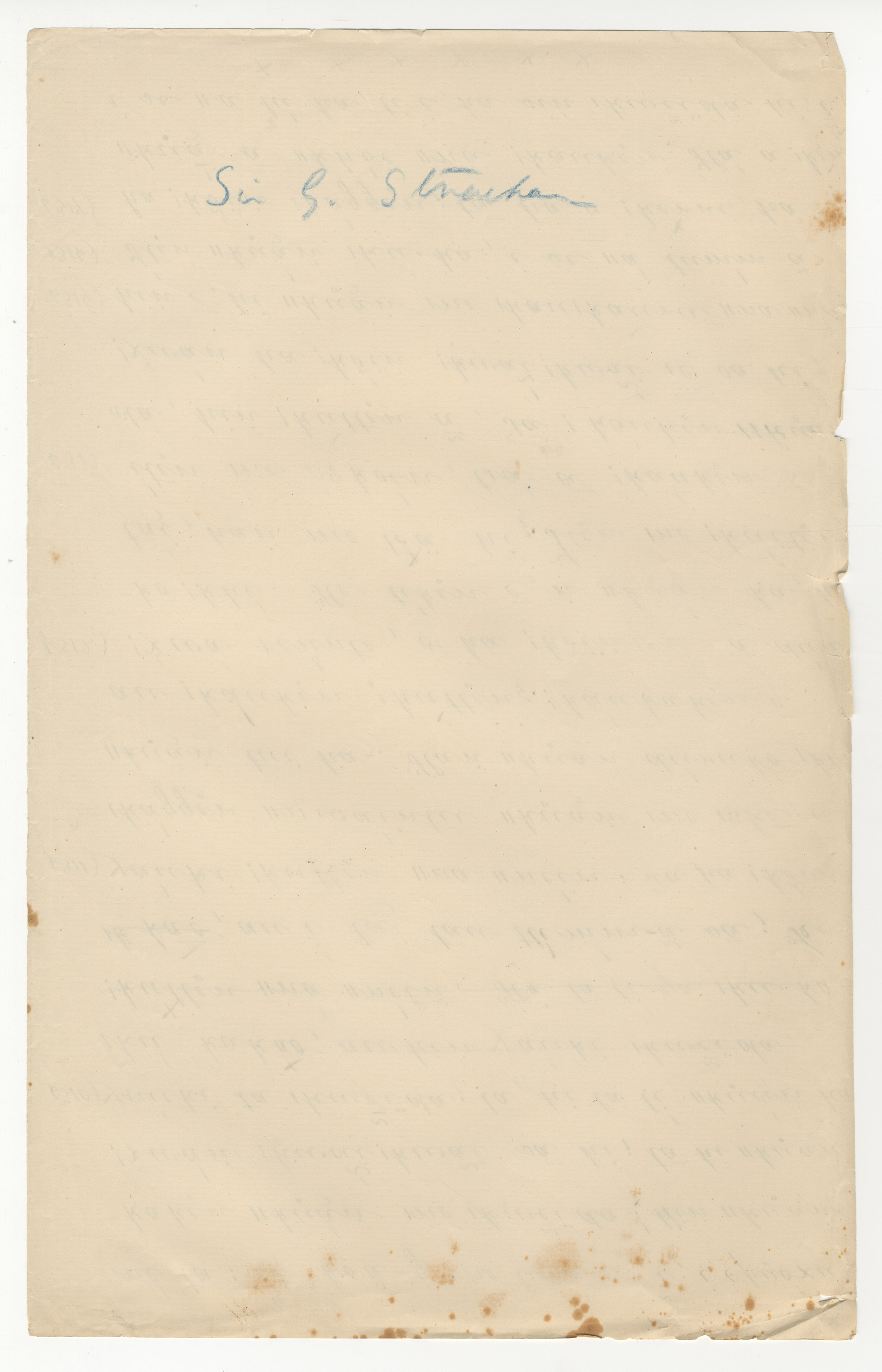 The reverse of page 2, with the name 'Sir G. Strachan' (? [the forename initial is unclear]) written at the top of the sheet in blue coloured pencil.