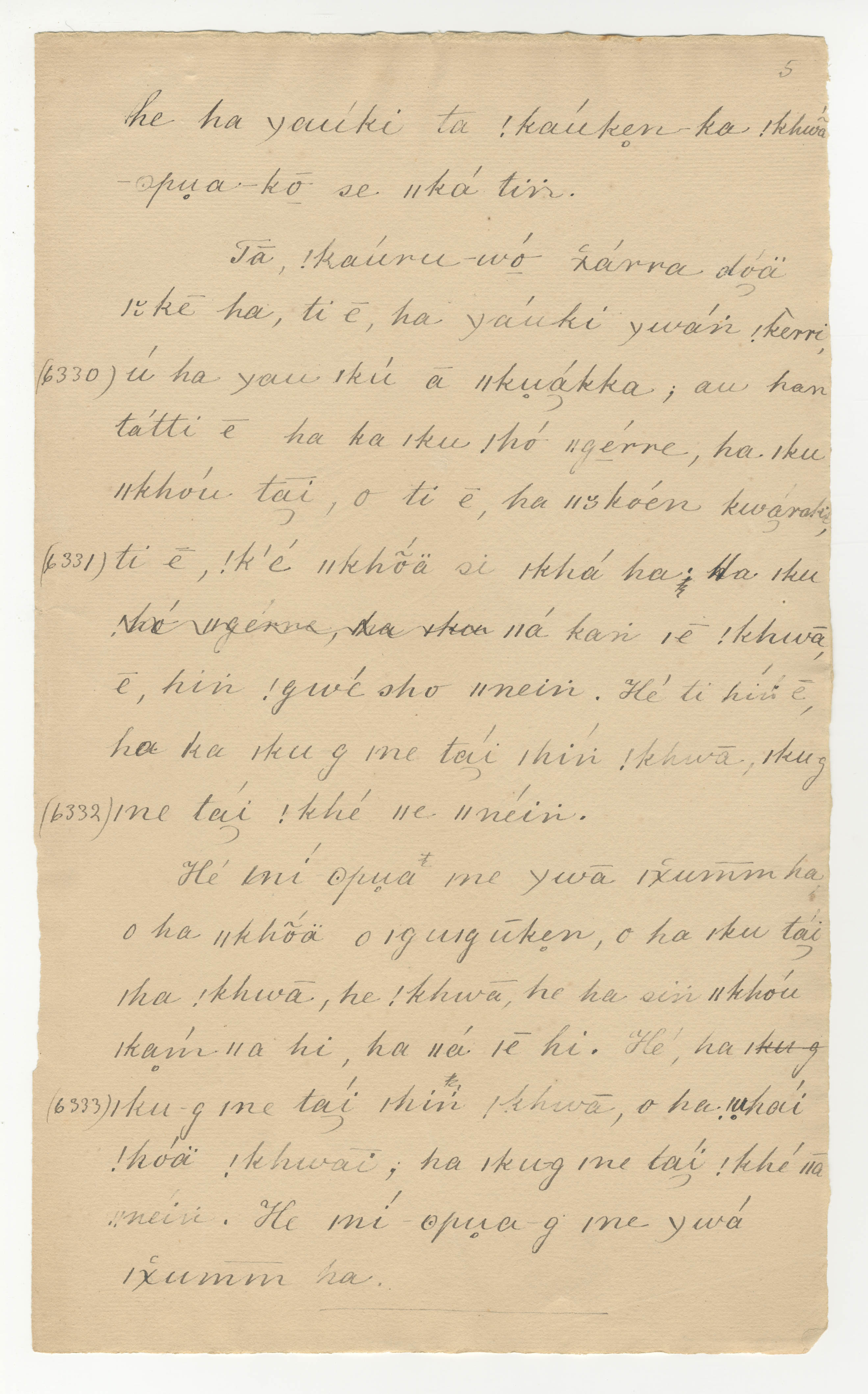 Manuscript page 5, taken from |han≠kass'o's story, The !kwai !kwai, the Mantis and the children -- in Lloyd notebook 3 (dated 1878 [started]), pages (continuing from) 6329 to 6333