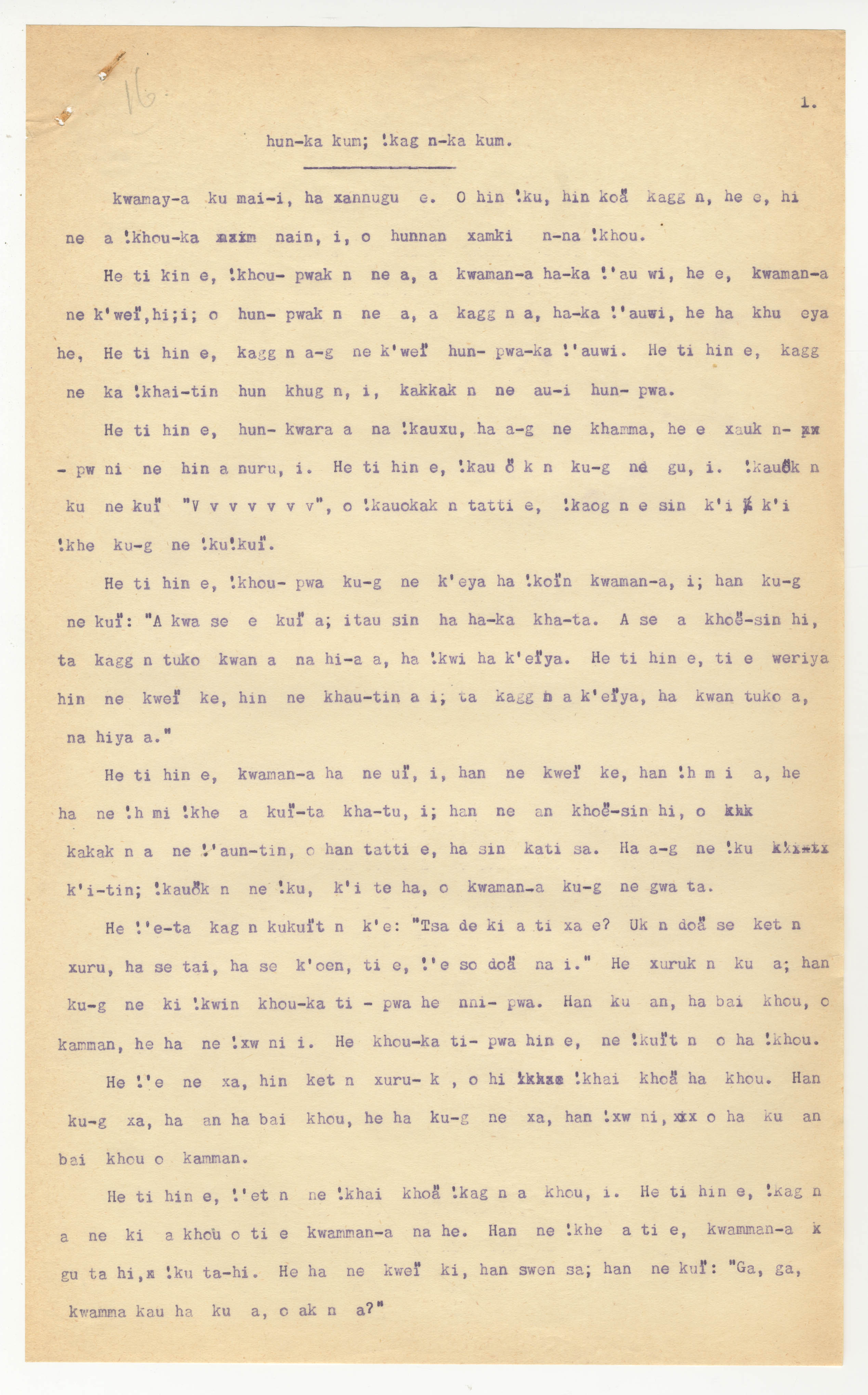 Manuscript page 1, taken from |han≠kass'o's story, The Mantis and |kwammana visit the Dassie's house in Lloyd notebook 2 (dated 1878 [started]), pages (6165 to ???? [6231?]) uncited. The |xam title is untranslated with unattributed material (i.e., no notebook pages).