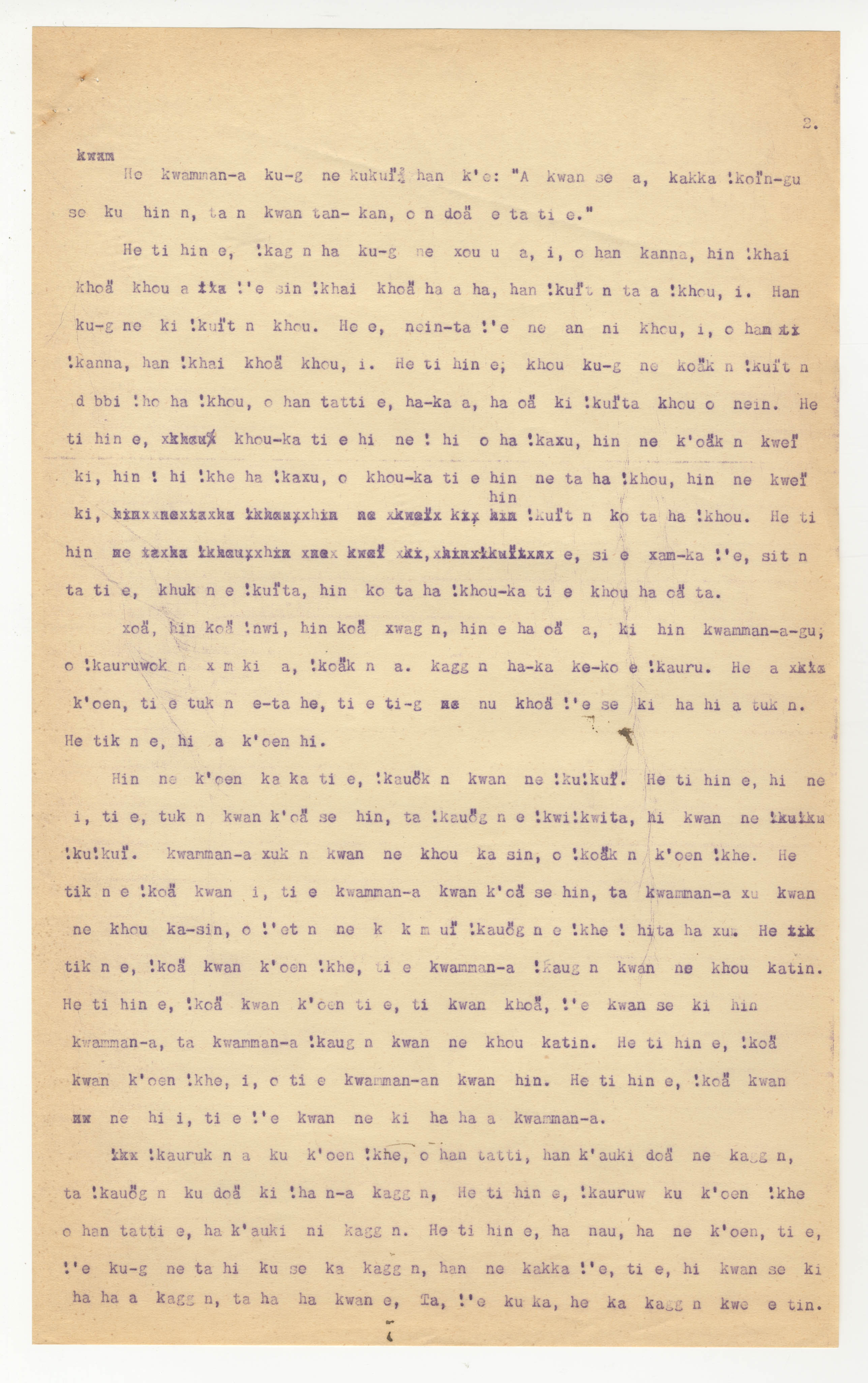 Manuscript page 2, taken from |han≠kass'o's story, The Mantis and |kwammana visit the Dassie's house in Lloyd notebook 2 (dated 1878 [started]), pages (6165 to ???? [6231?]) uncited. The |xam title is untranslated with unattributed material (i.e., no notebook pages).