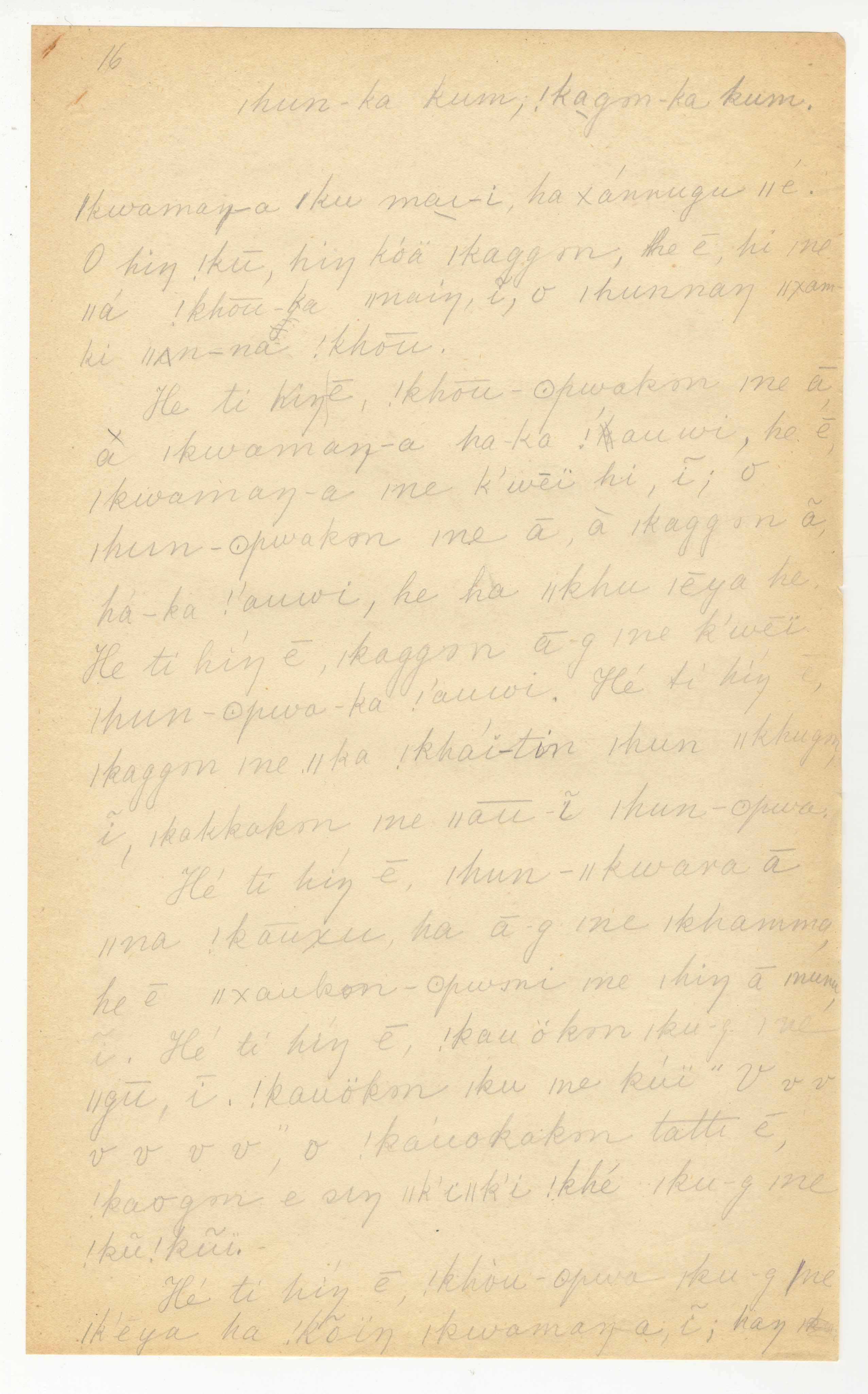 Manuscript page 1, taken from |han≠kass'o's story, The Mantis and |kwammana visit the Dassie's house in Lloyd notebook 2 (dated 1878 [started]), pages (6165 to ???? [6231?]) uncited. The |xam title is untranslated with unattributed material (i.e., no notebook pages).