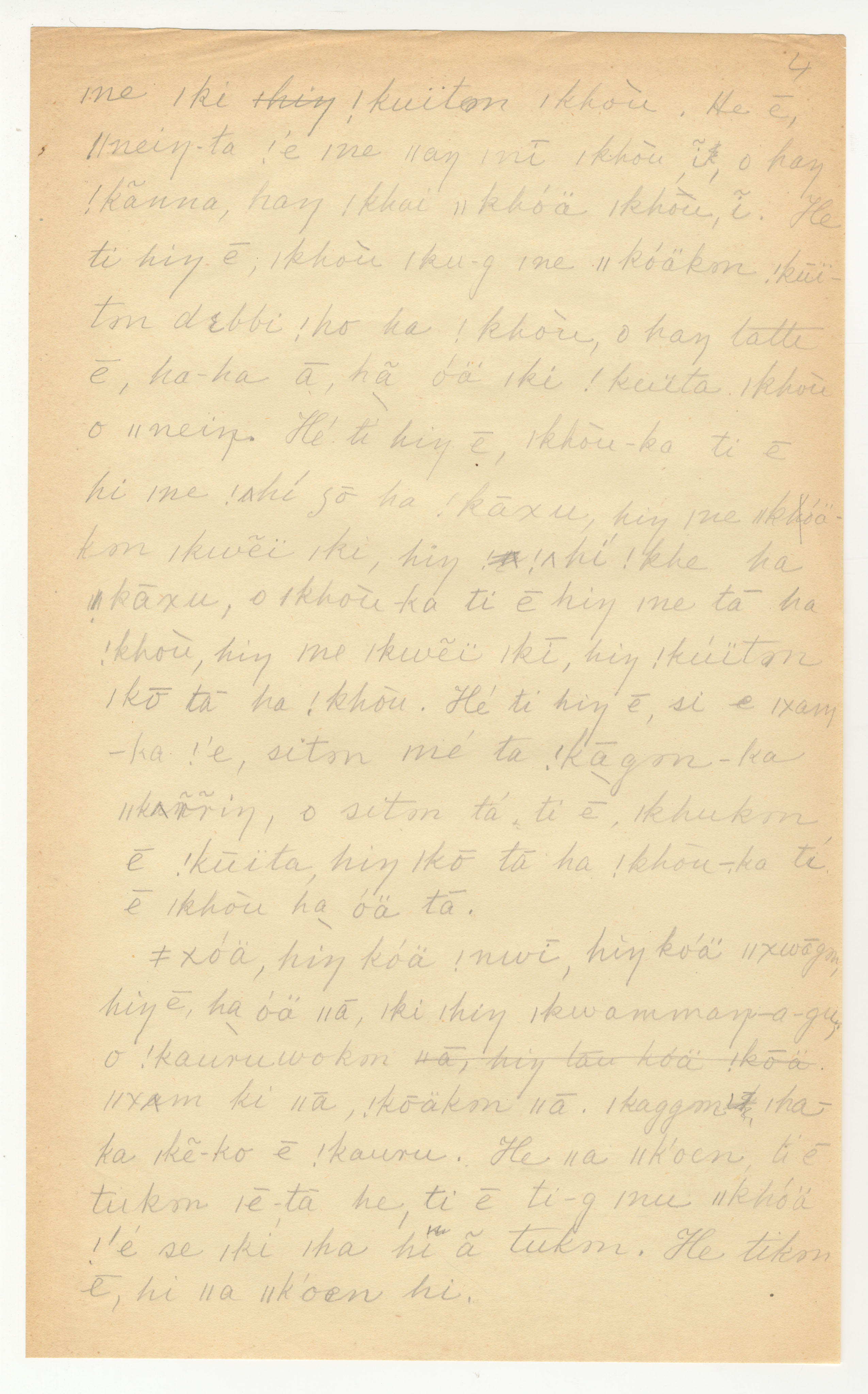 Manuscript page 4, taken from |han≠kass'o's story, The Mantis and |kwammana visit the Dassie's house in Lloyd notebook 2 (dated 1878 [started]), pages (6165 to ???? [6231?]) uncited. The |xam title is untranslated with unattributed material (i.e., no notebook pages).