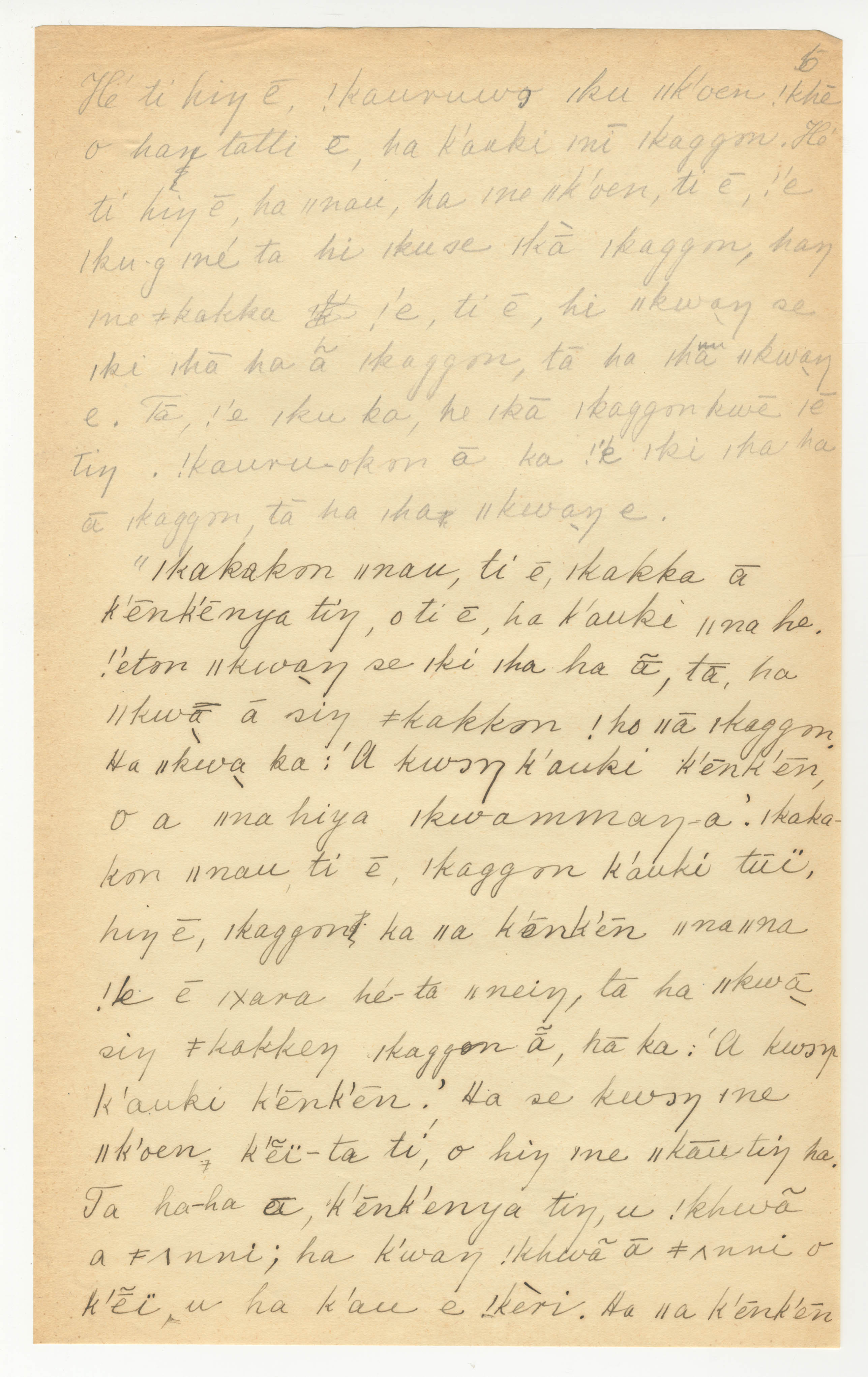 Manuscript page 6, taken from |han≠kass'o's story, The Mantis and |kwammana visit the Dassie's house in Lloyd notebook 2 (dated 1878 [started]), pages (6165 to ???? [6231?]) uncited. The |xam title is untranslated with unattributed material (i.e., no notebook pages).