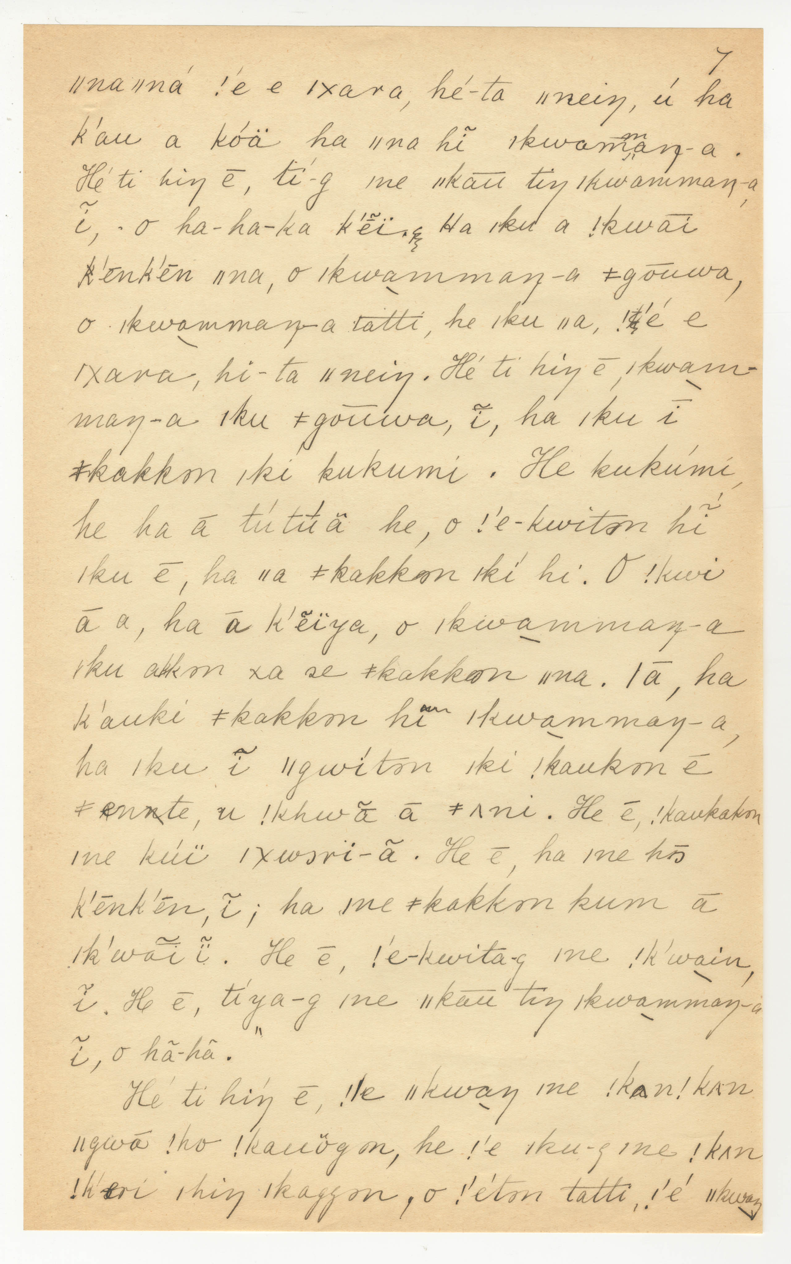 Manuscript page 7, taken from |han≠kass'o's story, The Mantis and |kwammana visit the Dassie's house in Lloyd notebook 2 (dated 1878 [started]), pages (6165 to ???? [6231?]) uncited. The |xam title is untranslated with unattributed material (i.e., no notebook pages).
