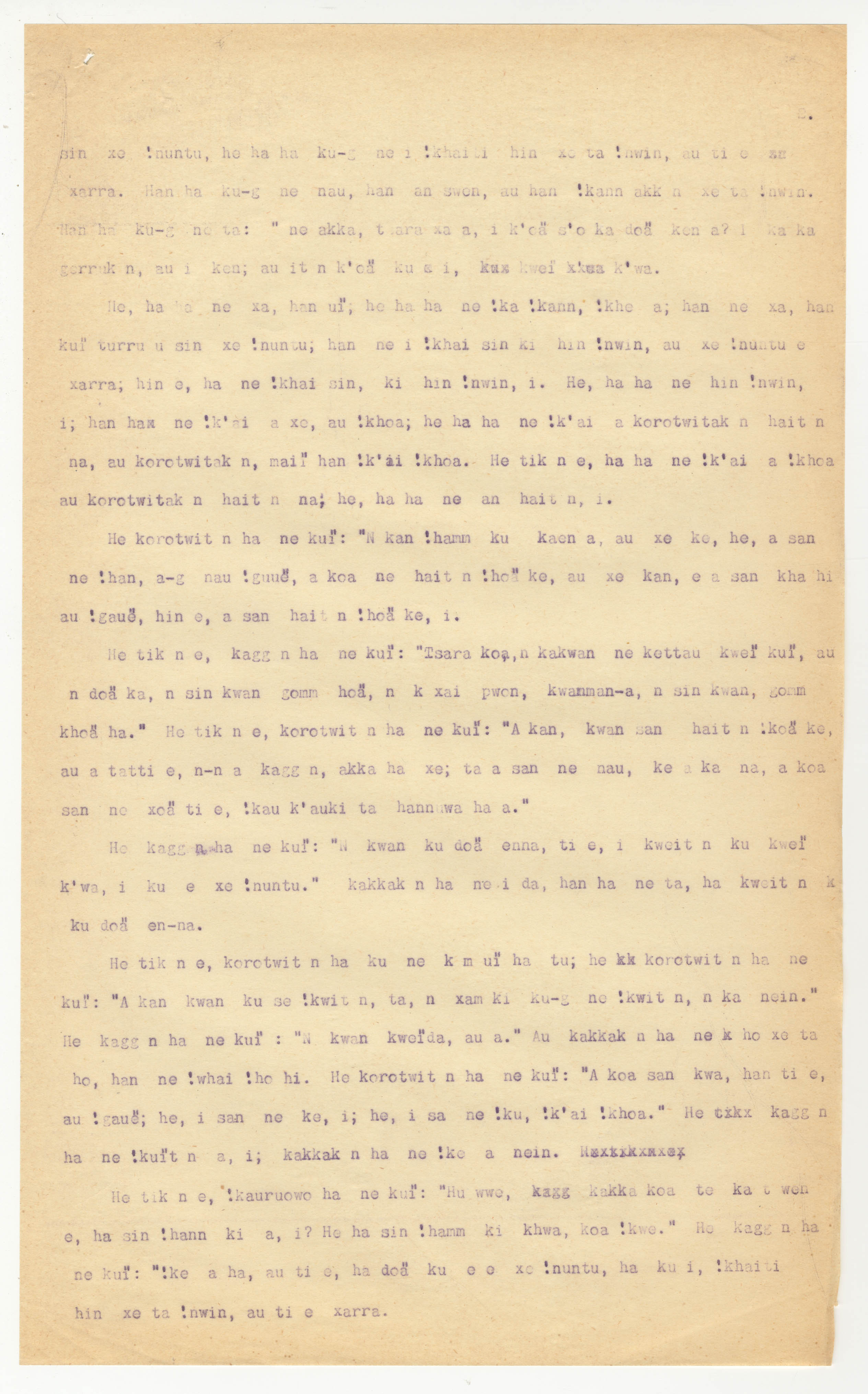 Manuscript page 2, taken from |han≠kass'o's story, The Mantis and Koro-tuiten -- in Lloyd notebook 10 (dated 1878), pages (6885 to 6939 [full story]) uncited. The |xam title is untranslated with unattributed material (i.e., no notebook pages).
