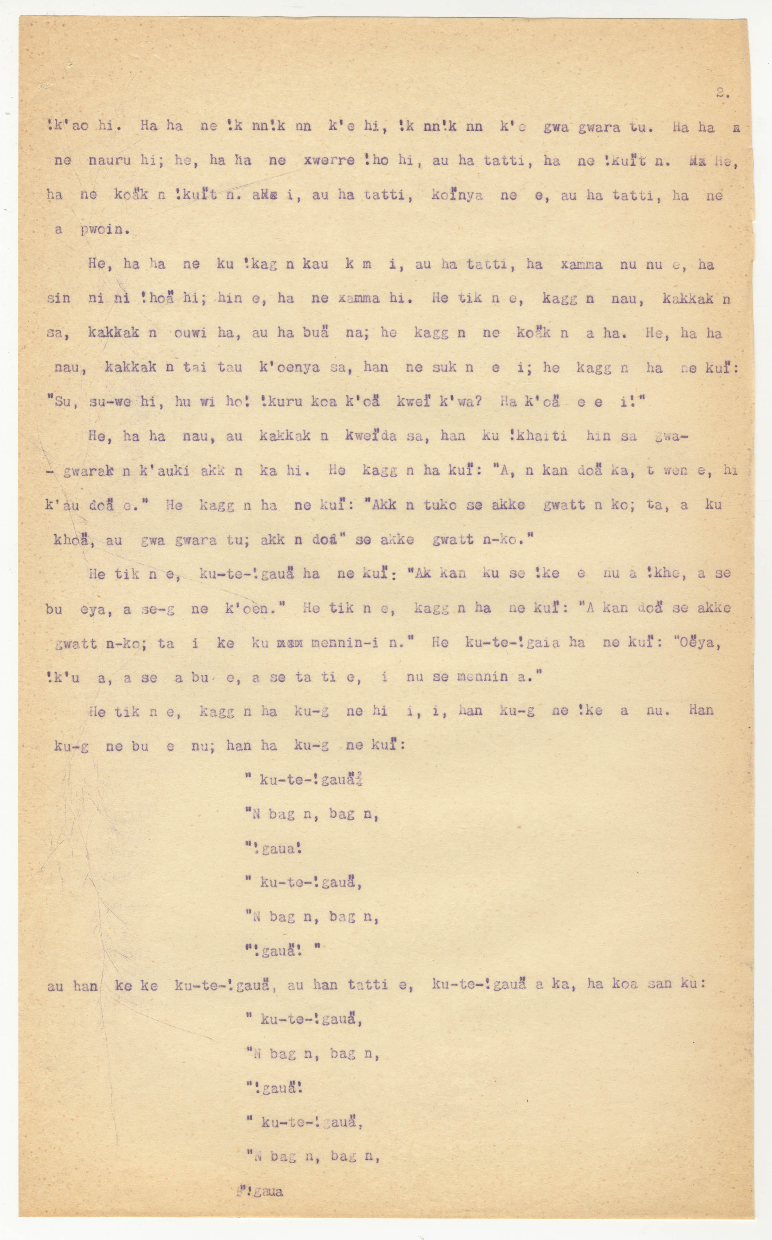 Manuscript page 2, taken from |han≠kass'o's story, |ku-te-!gaua and |kaggen -- in Lloyd notebook 11 (dated 1878), pages (7015-7031, 7032-7064 [full story]) uncited. The |xam title is untranslated with unattributed material (i.e., no notebook pages).