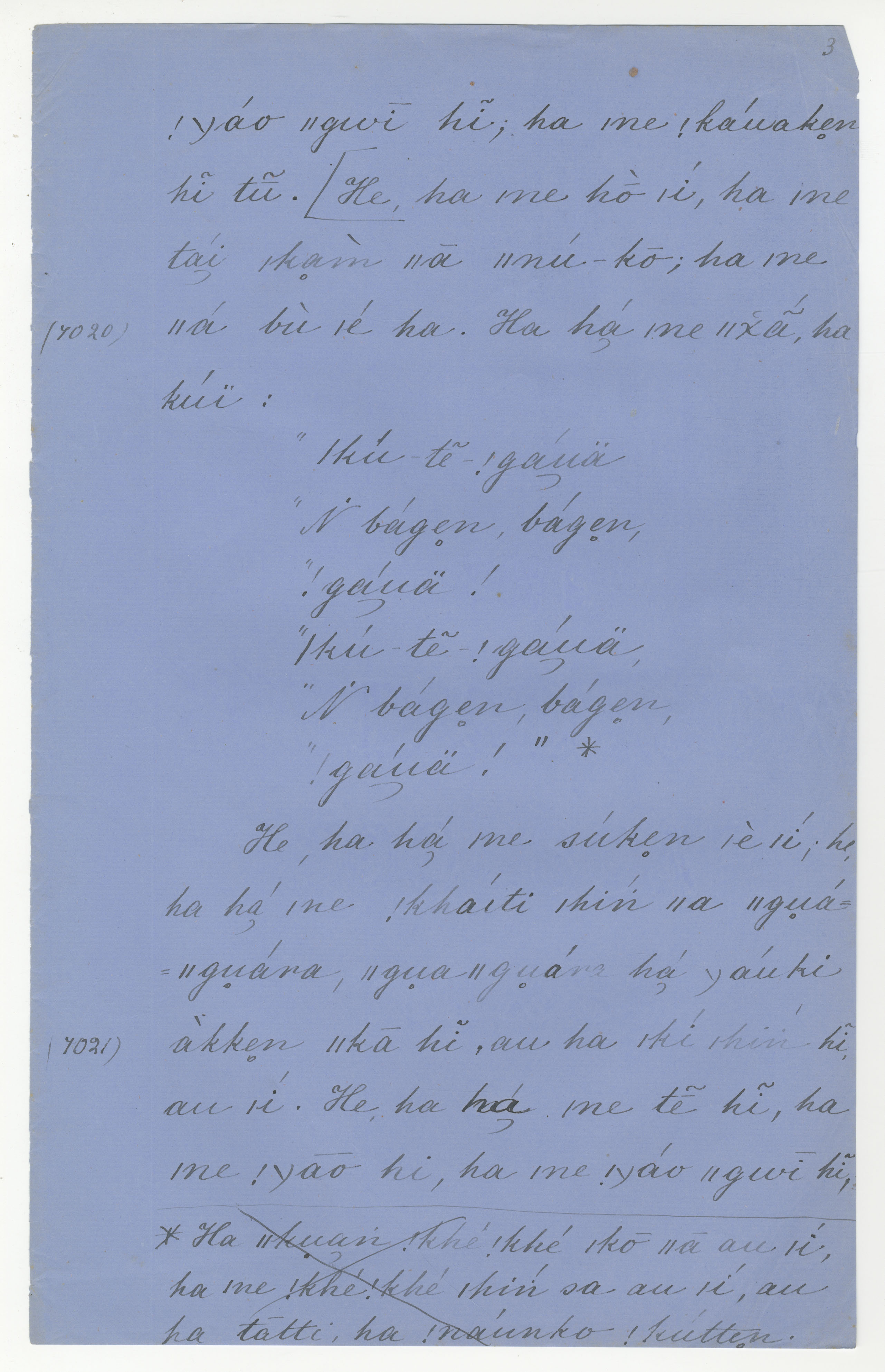Manuscript page 3, taken from |han≠kass'o's story, |ku-te-!gaua and |kaggen -- in Lloyd notebook 11 (dated 1878), pages (continuing from) 7019 to 7021.