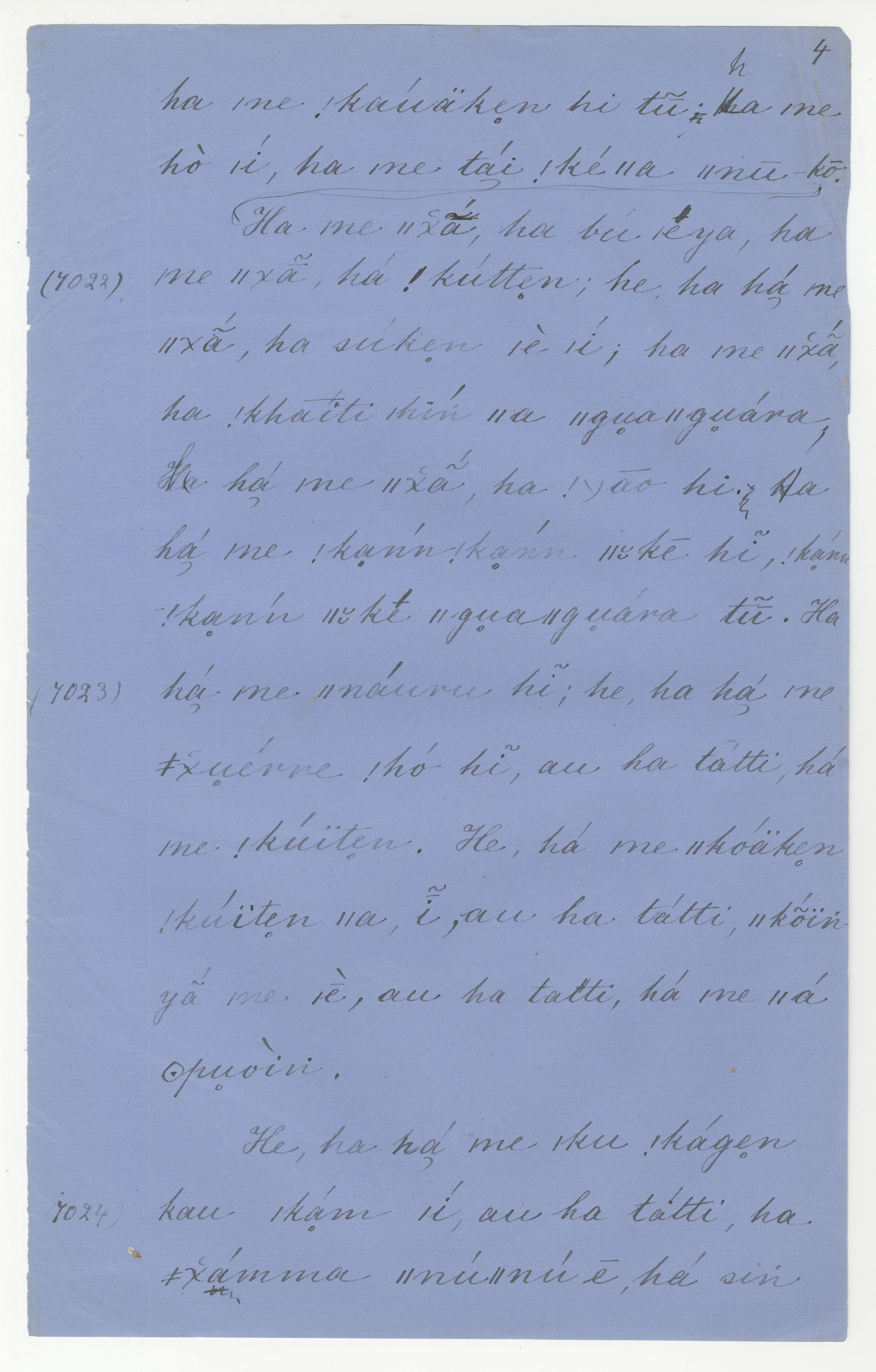 Manuscript page 4, taken from |han≠kass'o's story, |ku-te-!gaua and |kaggen -- in Lloyd notebook 11 (dated 1878), pages (continuing from) 7021 to 7024.
