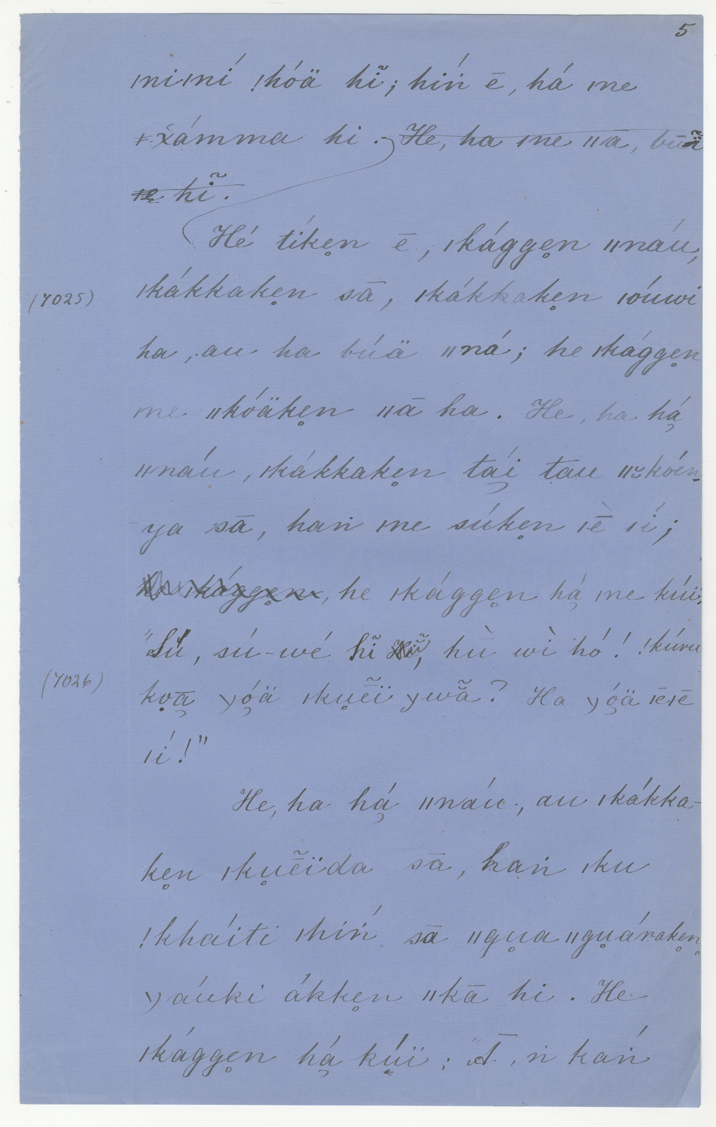 Manuscript page 5, taken from |han≠kass'o's story, |ku-te-!gaua and |kaggen -- in Lloyd notebook 11 (dated 1878), pages (continuing from) 7024 to 7026.