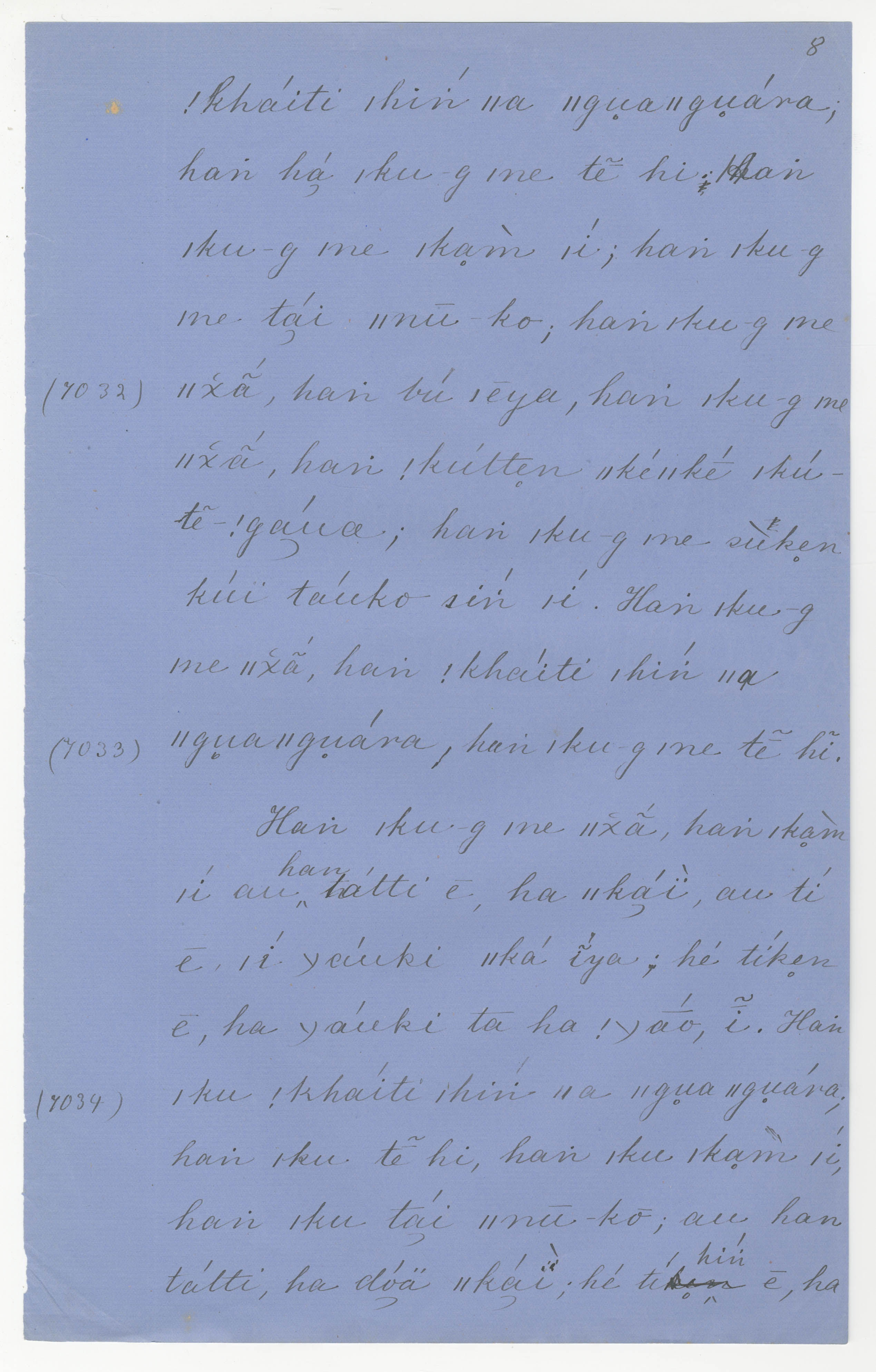 Manuscript page 8, taken from |han≠kass'o's story, |ku-te-!gaua and |kaggen -- in Lloyd notebook 11 (dated 1878), pages (continuing from) 7031 to 7034.