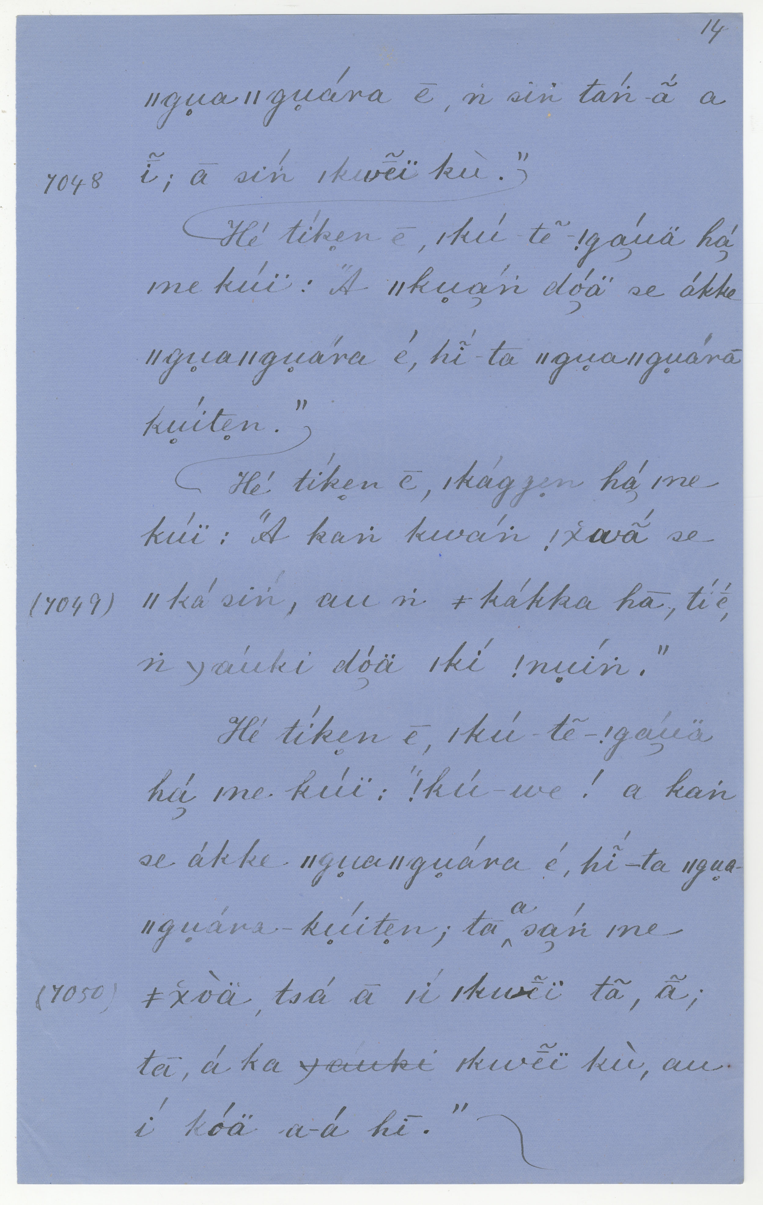 Manuscript page 14, taken from |han≠kass'o's story, |ku-te-!gaua and |kaggen -- in Lloyd notebook 11 (dated 1878), pages (continuing from) 7047 to 7050.