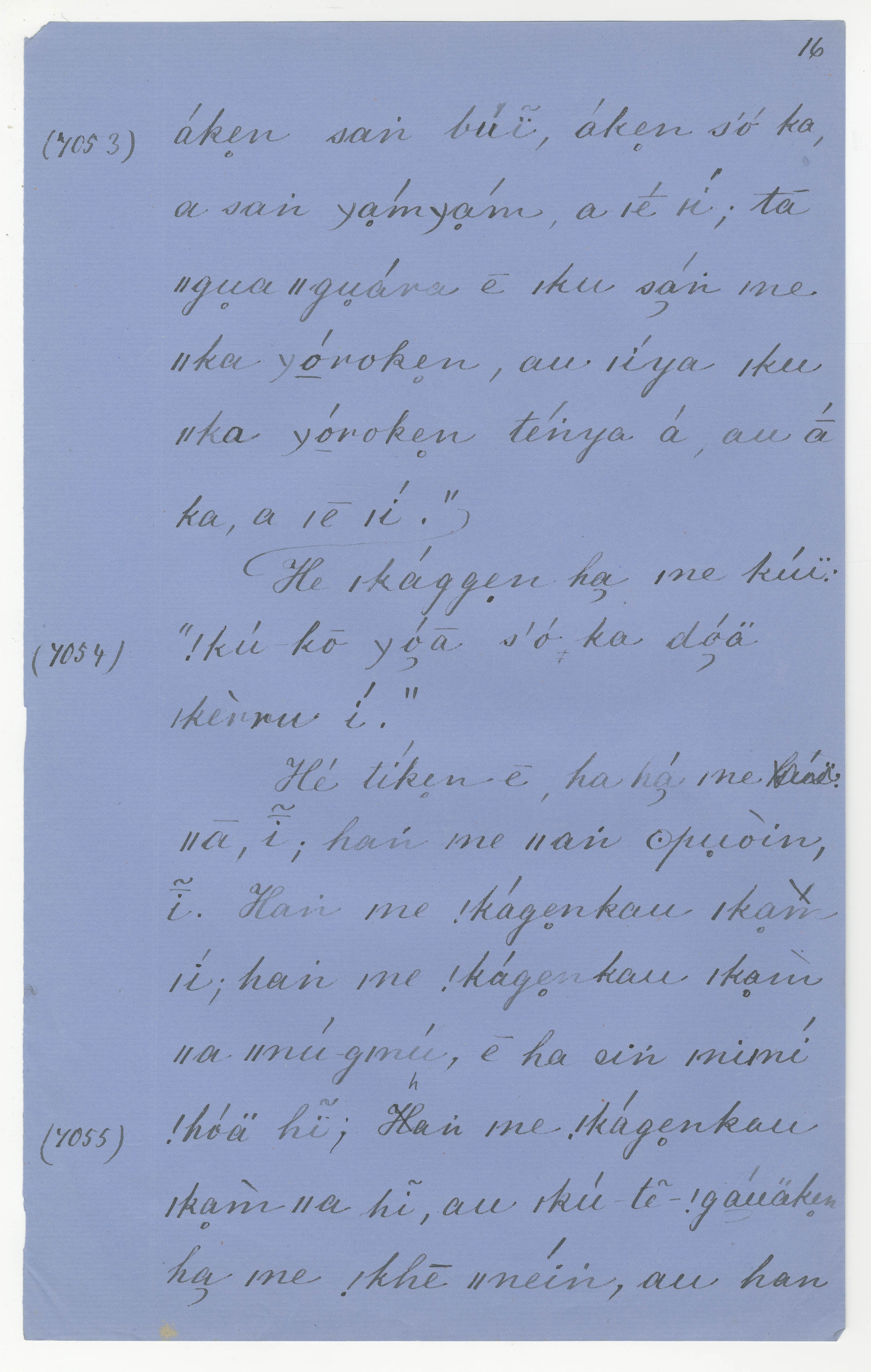 Manuscript page 16, taken from |han≠kass'o's story, |ku-te-!gaua and |kaggen -- in Lloyd notebook 11 (dated 1878), pages 7053 to 7055.