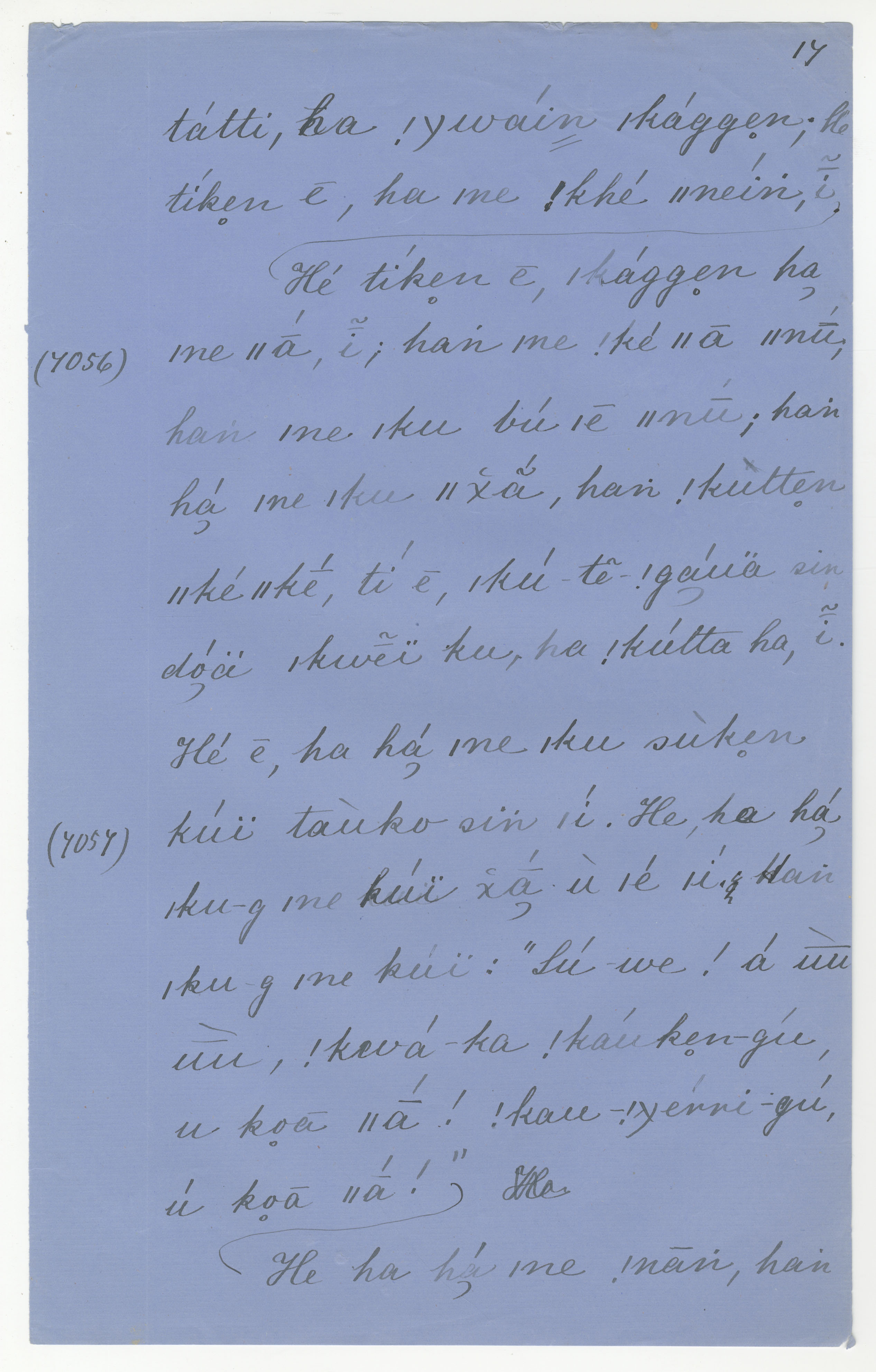 Manuscript page 17, taken from |han≠kass'o's story, |ku-te-!gaua and |kaggen -- in Lloyd notebook 11 (dated 1878), pages (continuing from) 7055 to 7057.