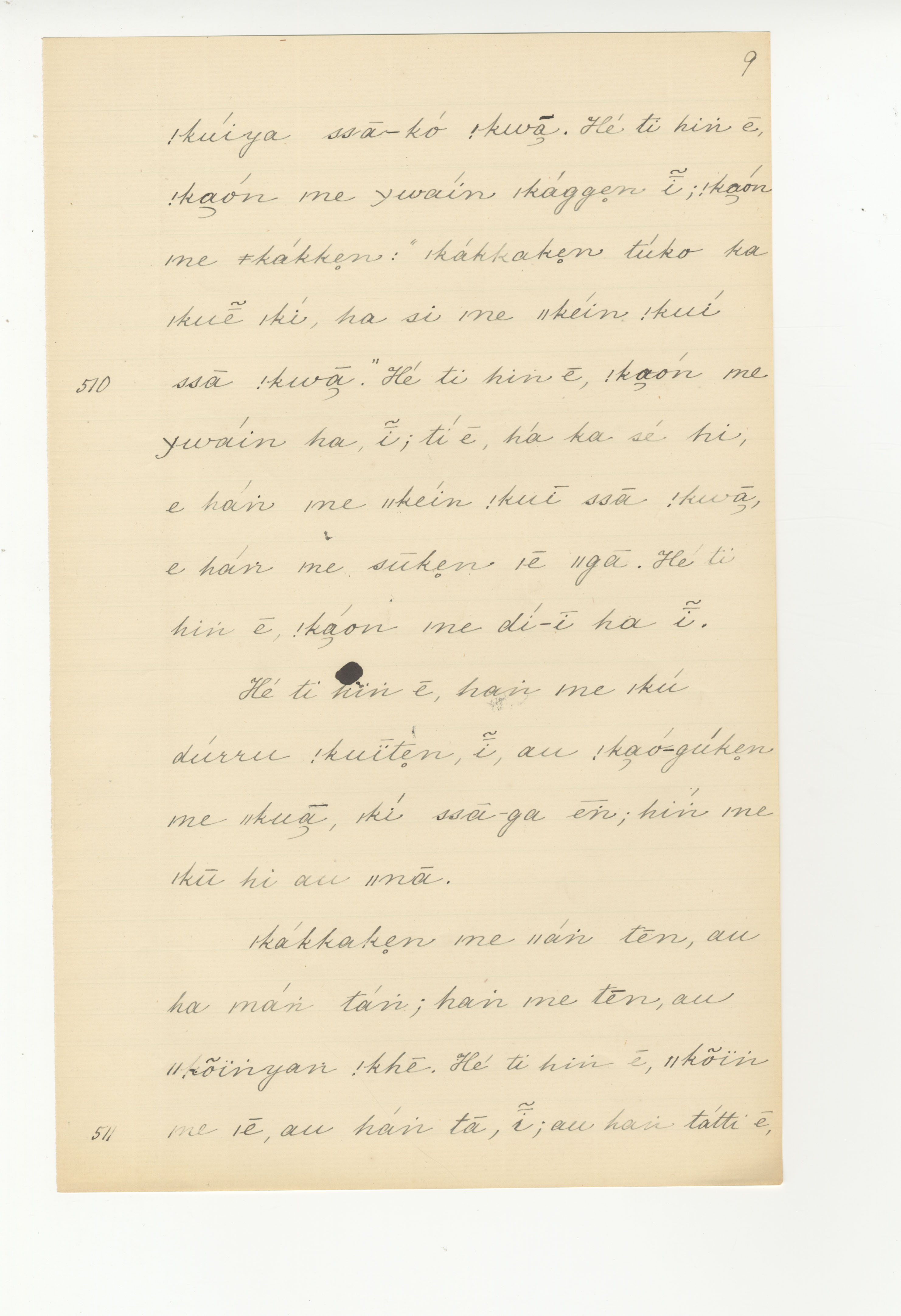 Manuscript page taken from ǁkabbo's story, The |kaggen who took |kammanga's shoe, and turned it into an eland -- in Lloyd notebook 4 (dated 1871), pages (continuing from) 509 to 511.