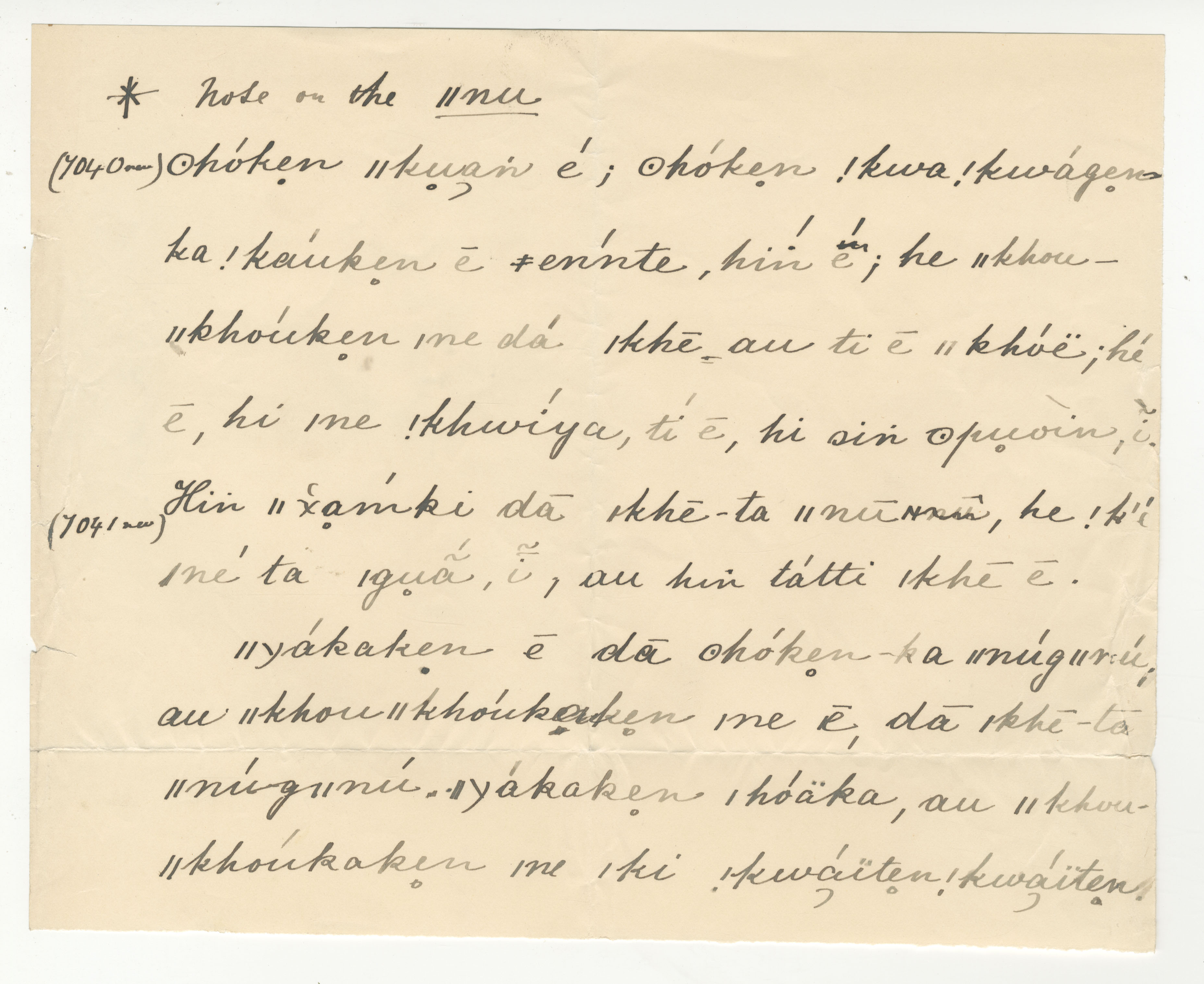 A handwritten insert in black ink with annotations/corrections in the same medium, with four-digit numbers (Lucy Lloyd's notebook pages) in the left margin. A note at the top of the sheet reads '*note on the ǁnu'.