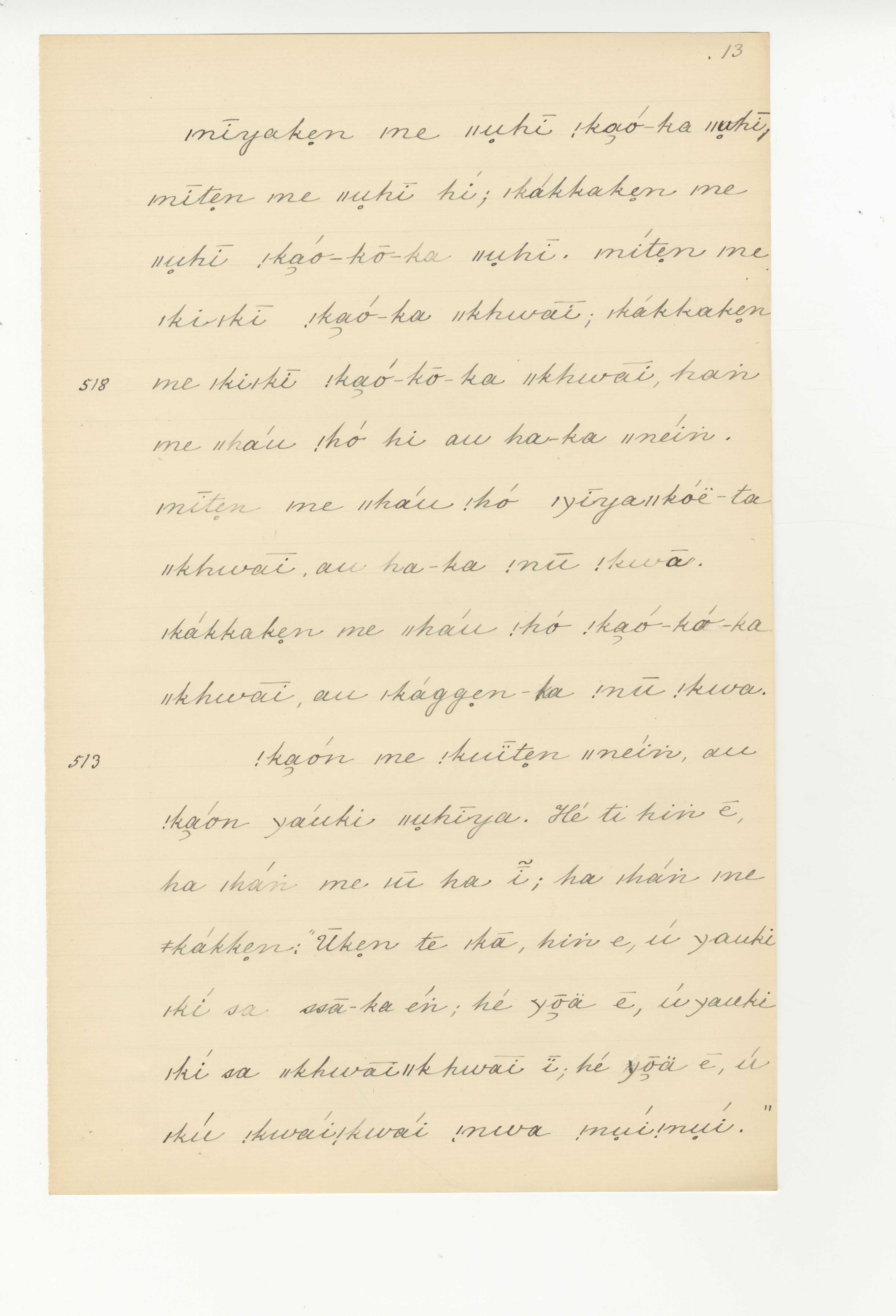 Manuscript page taken from ǁkabbo's story, The |kaggen who took |kammanga's shoe, and turned it into an eland -- in Lloyd notebook 4 (dated 1871), pages (continuing from) 517 to 518, and 513.