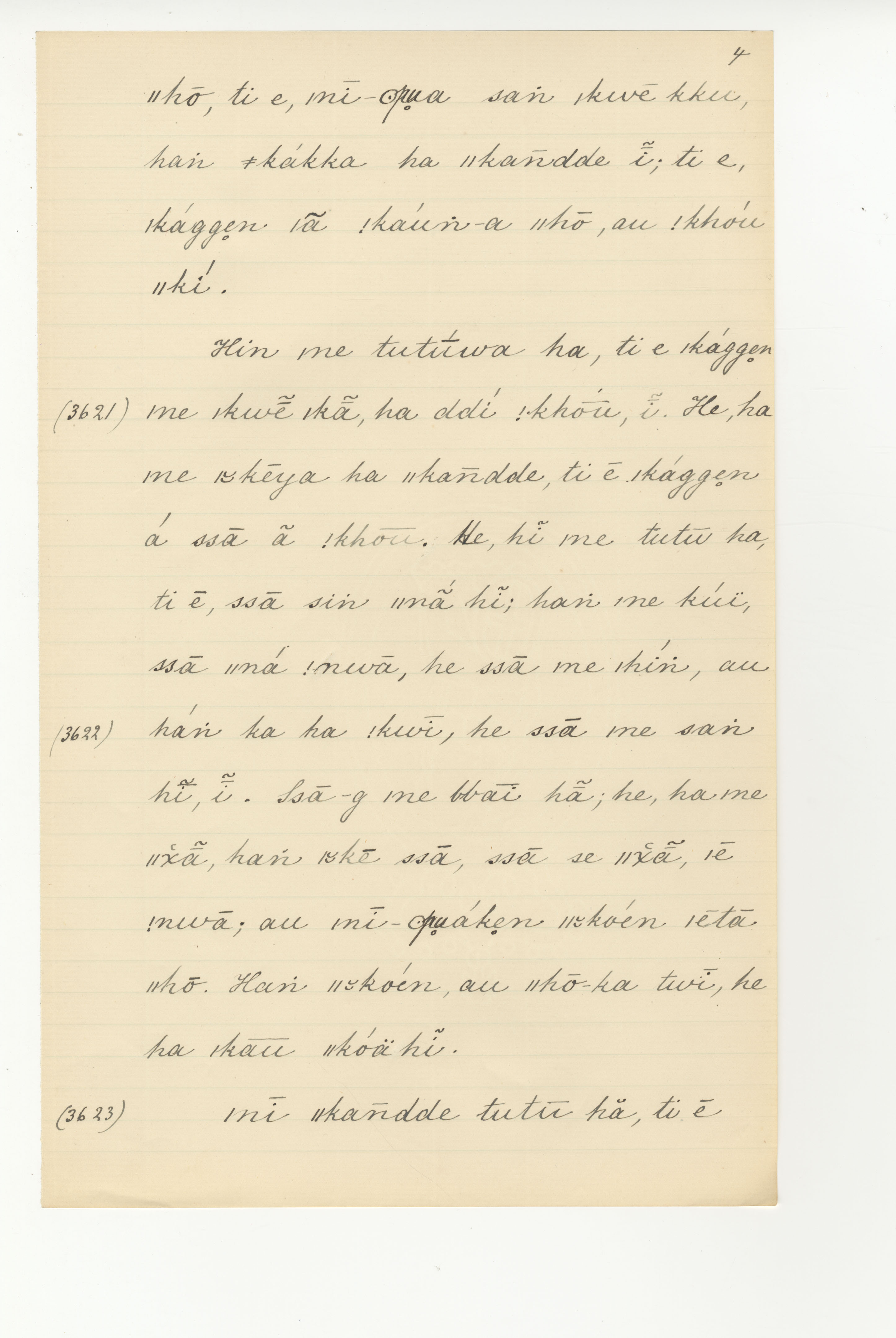 Manuscript page taken from Dia!kwain's story, How the Ichneumon discovered what the Mantis did with his honey -- in Lloyd notebook 4 (dated 1873 to 1874), pages (continuing from) 3620 to 3623.