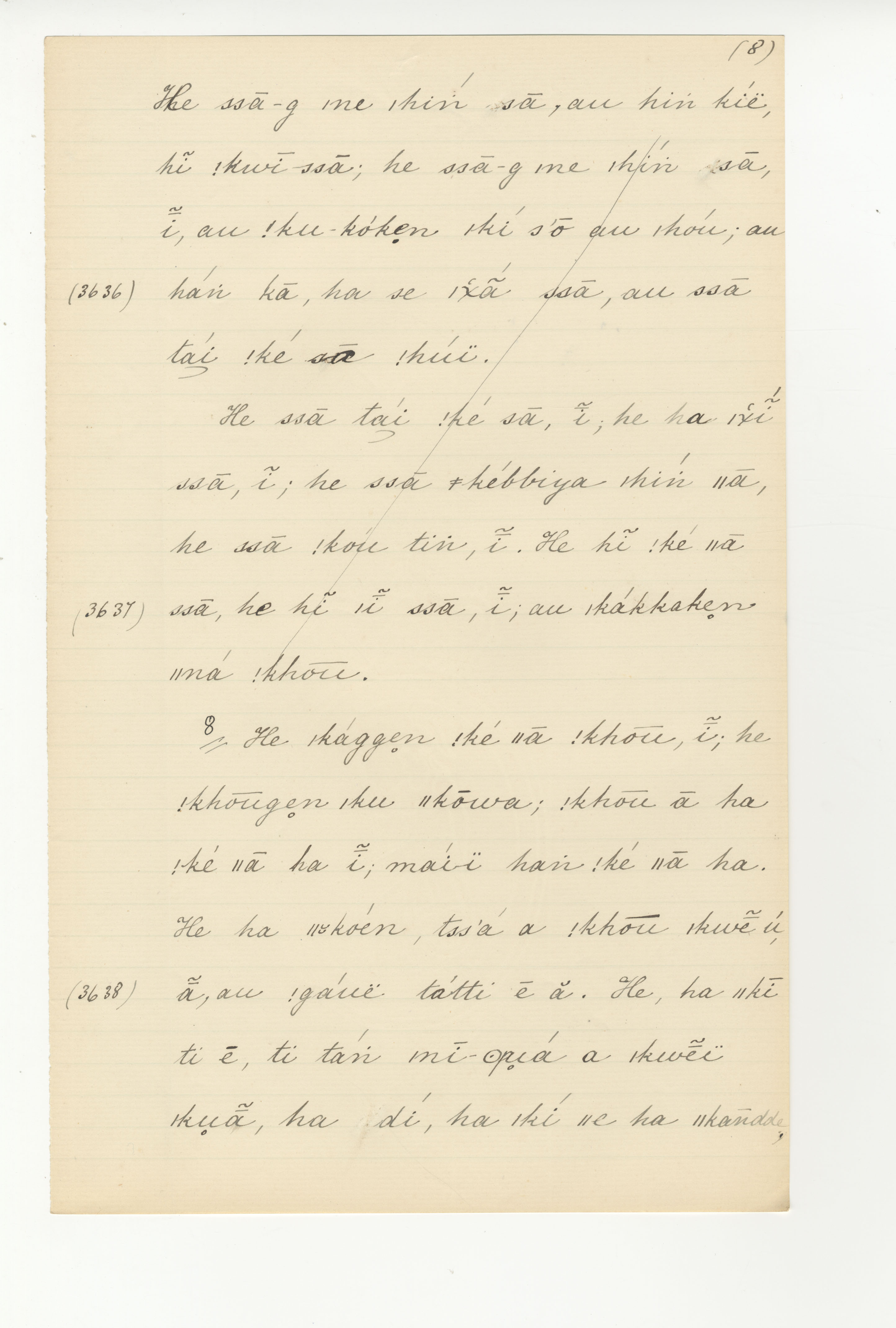 Manuscript page taken from Dia!kwain's story, How the Ichneumon discovered what the Mantis did with his honey -- in Lloyd notebook 4 (dated 1873 to 1874), pages (continuing from) 3635 to 3638.