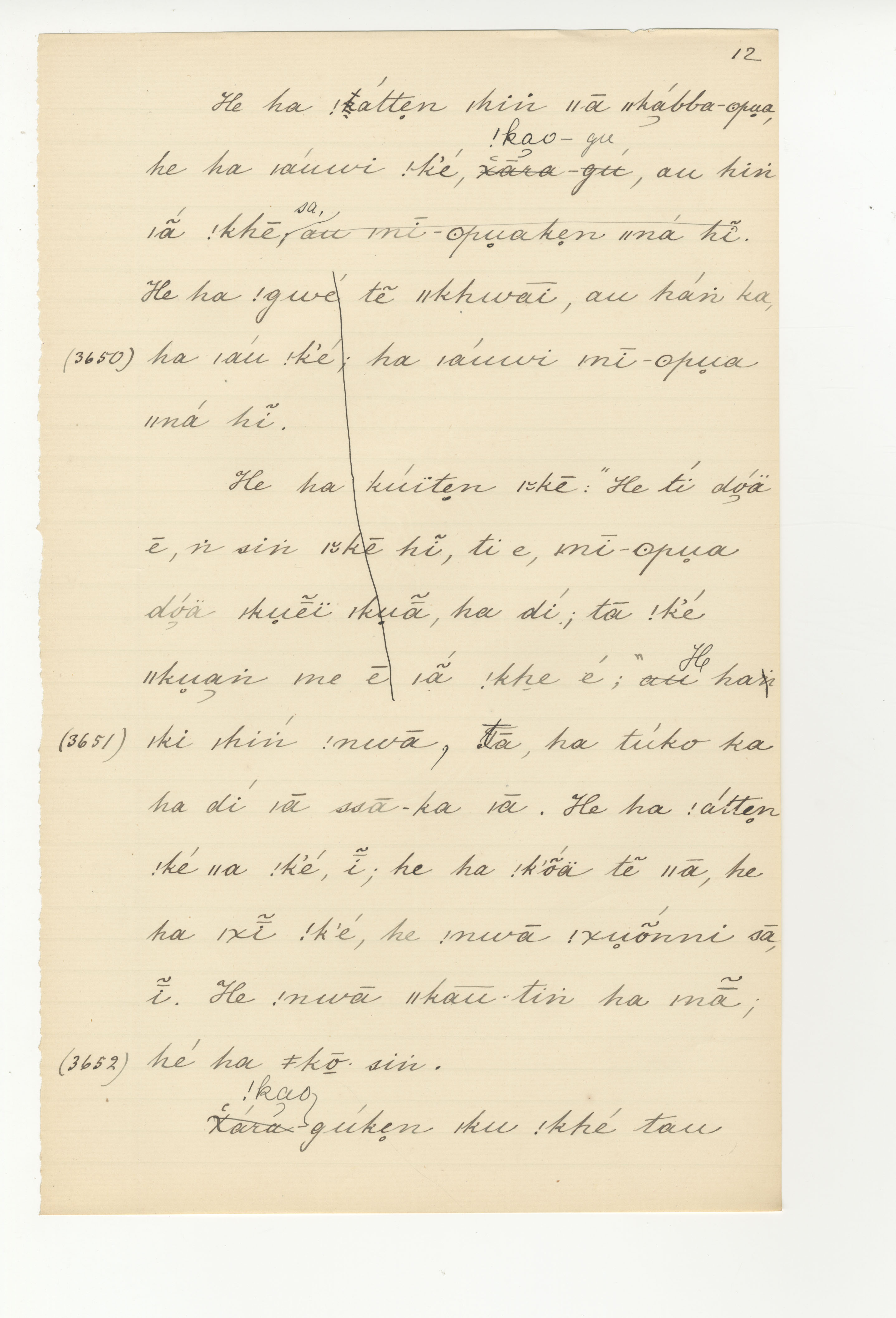 Manuscript page taken from Dia!kwain's story, How the Ichneumon discovered what the Mantis did with his honey -- in Lloyd notebook 4 (dated 1873 to 1874), pages (continuing from) 3649 to 3652 (p. 3650 is partially cancelled).