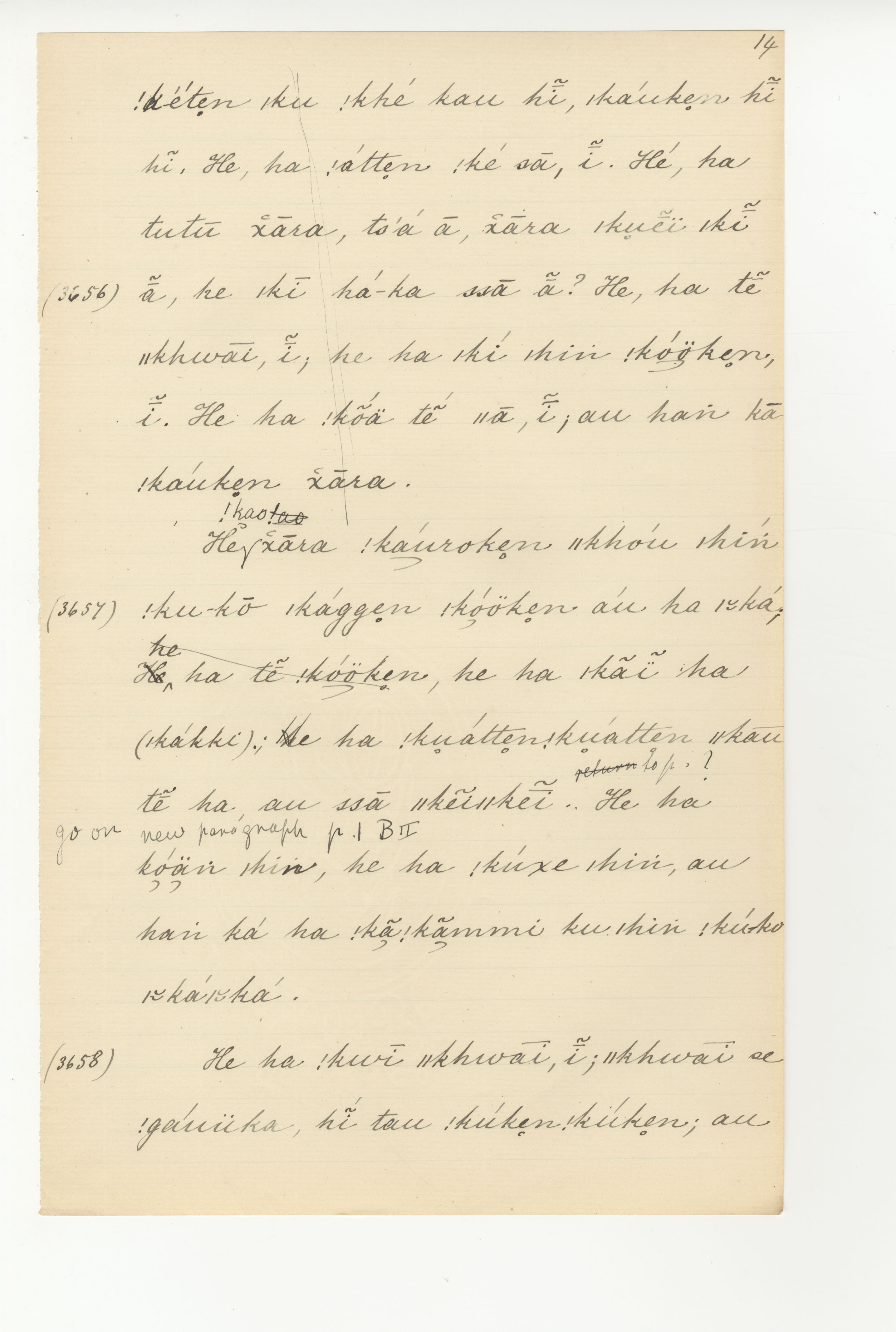 Manuscript page taken from Dia!kwain's story, How the Ichneumon discovered what the Mantis did with his honey -- in Lloyd notebook 4 (dated 1873 to 1874), pages (continuing from) 3655 to 3658.