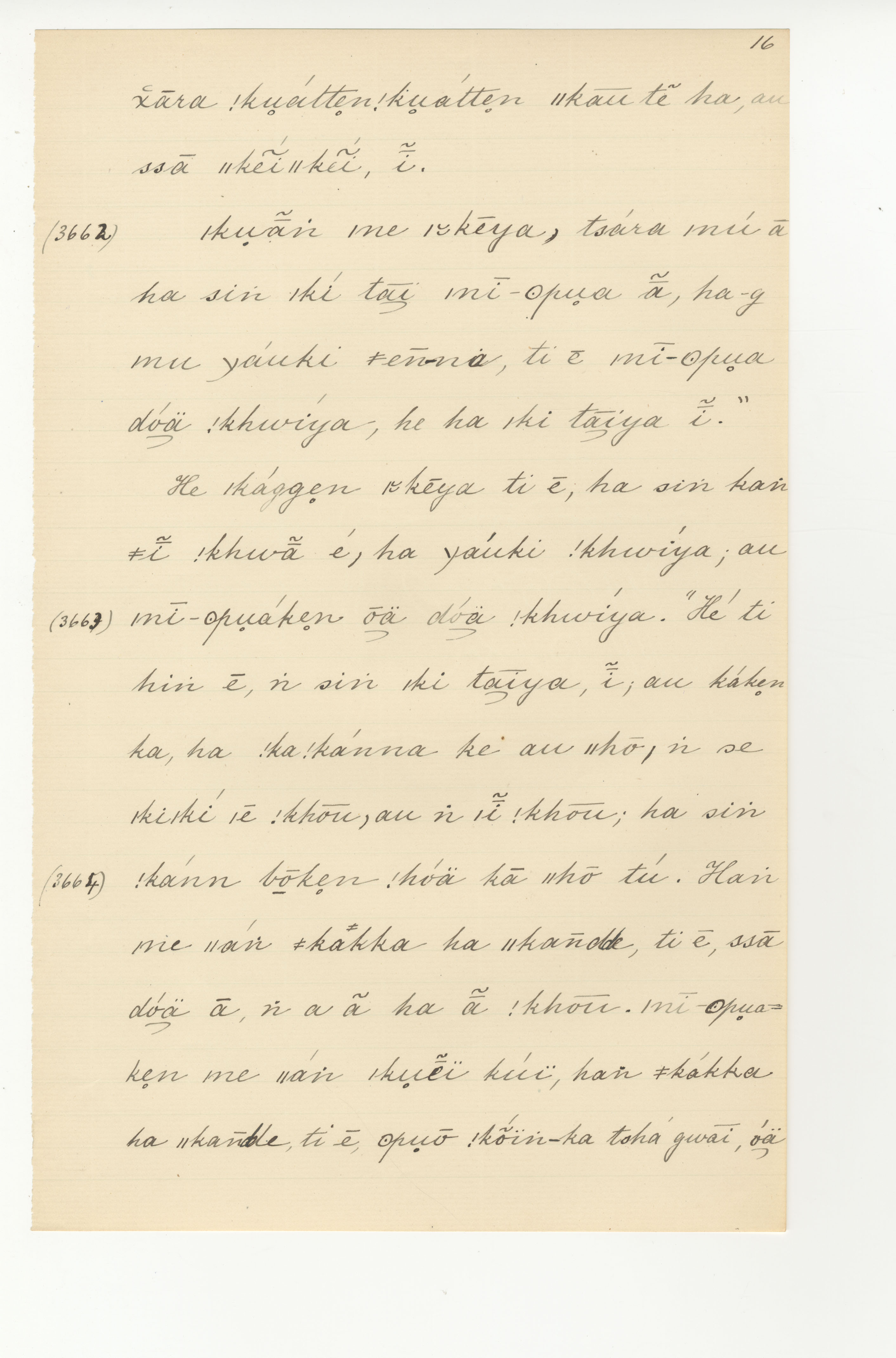 Manuscript page taken from Dia!kwain's story, How the Ichneumon discovered what the Mantis did with his honey -- in Lloyd notebook 4 (dated 1873 to 1874), pages (continuing from) 3661 to 3664.