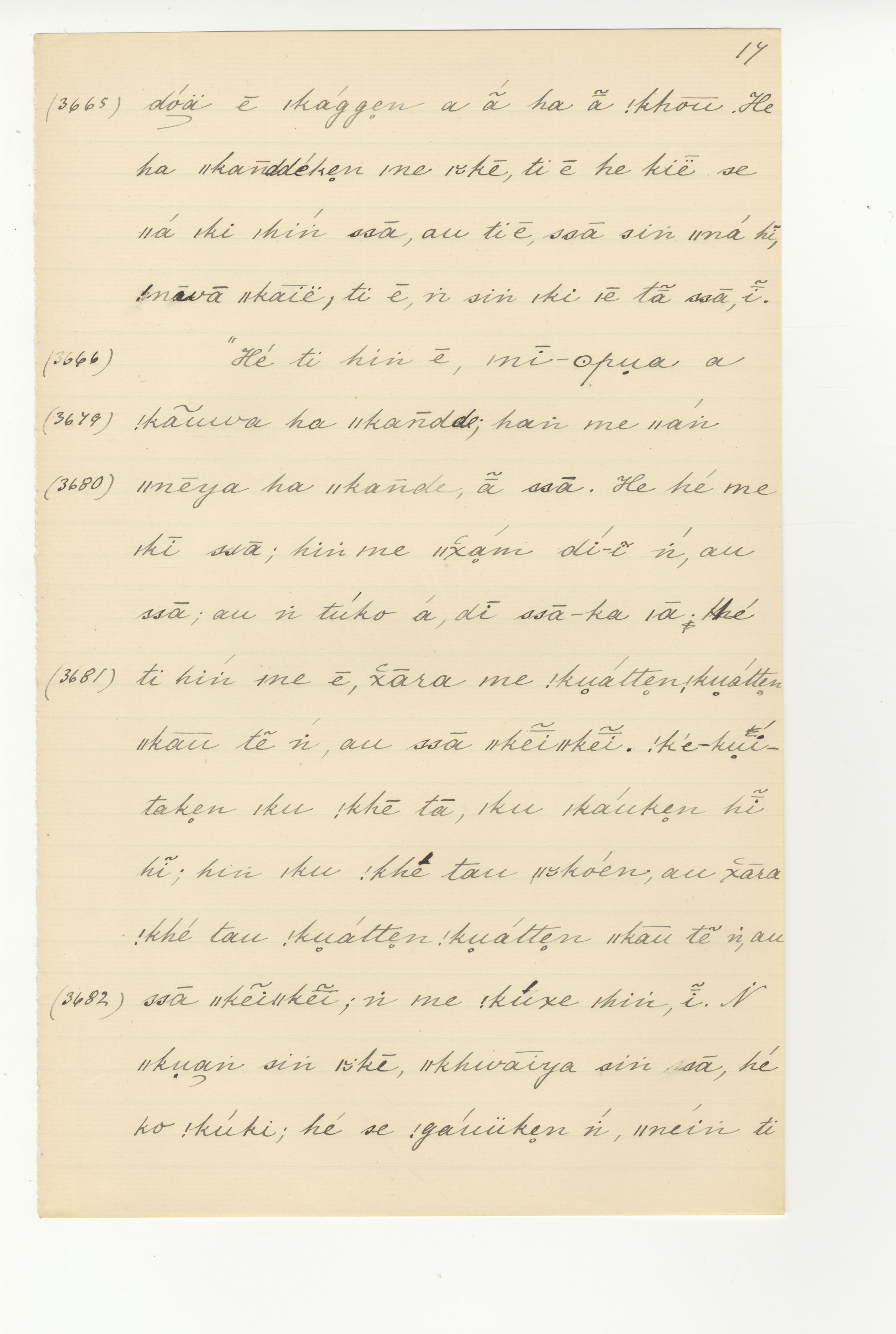 Manuscript page taken from Dia!kwain's story, How the Ichneumon discovered what the Mantis did with his honey -- in Lloyd notebook 4 (dated 1873 to 1874), pages 3665 to 3682.