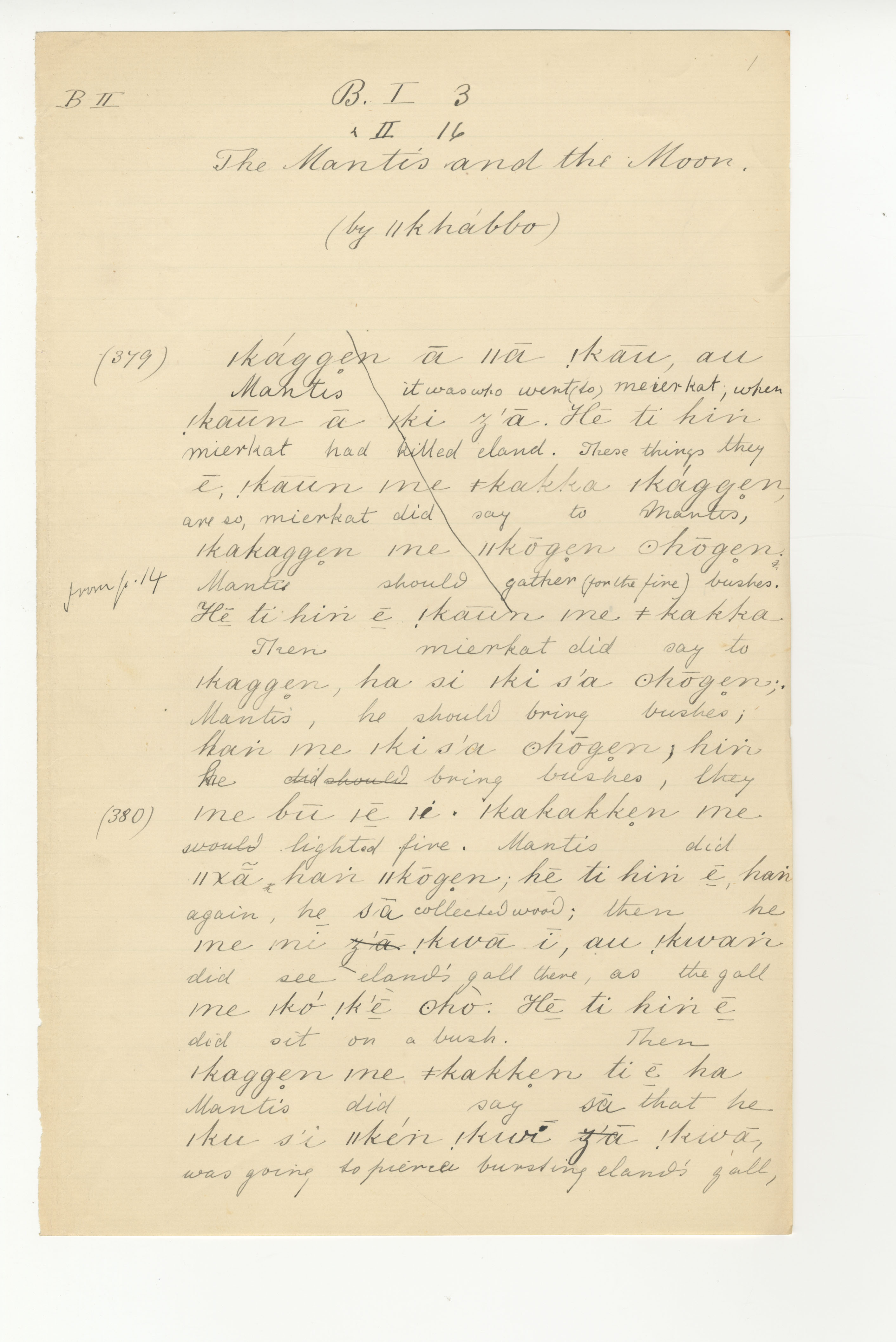 Manuscript page taken from ǁkabbo's story, |kaggen (the Mantis) and the Moon (version 1) -- in Bleek notebook 2 (dated 1871, 1872, 1873 [notes added]), pages 379 to 380.