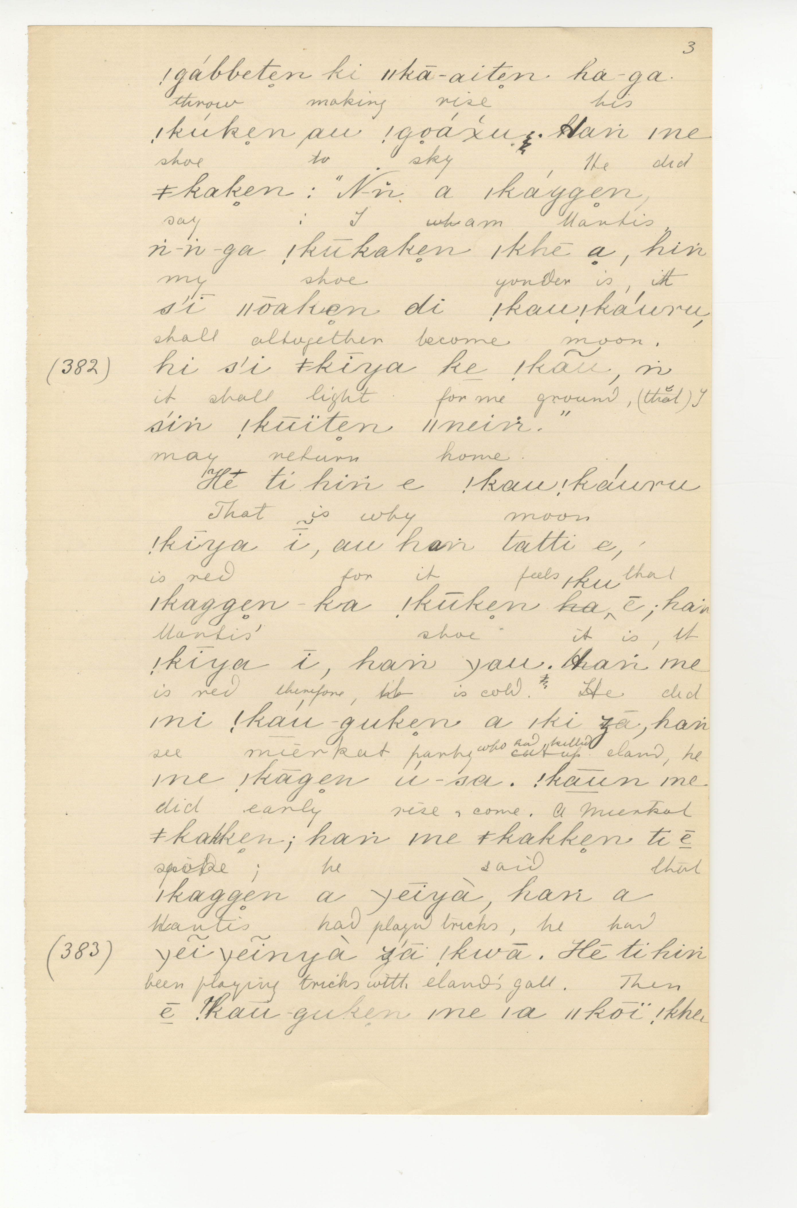 Manuscript page taken from ǁkabbo's story, |kaggen (the Mantis) and the Moon (version 1) -- in Bleek notebook 2 (dated 1871, 1872, 1873 [notes added]), pages (continuing from) 381 to 383.