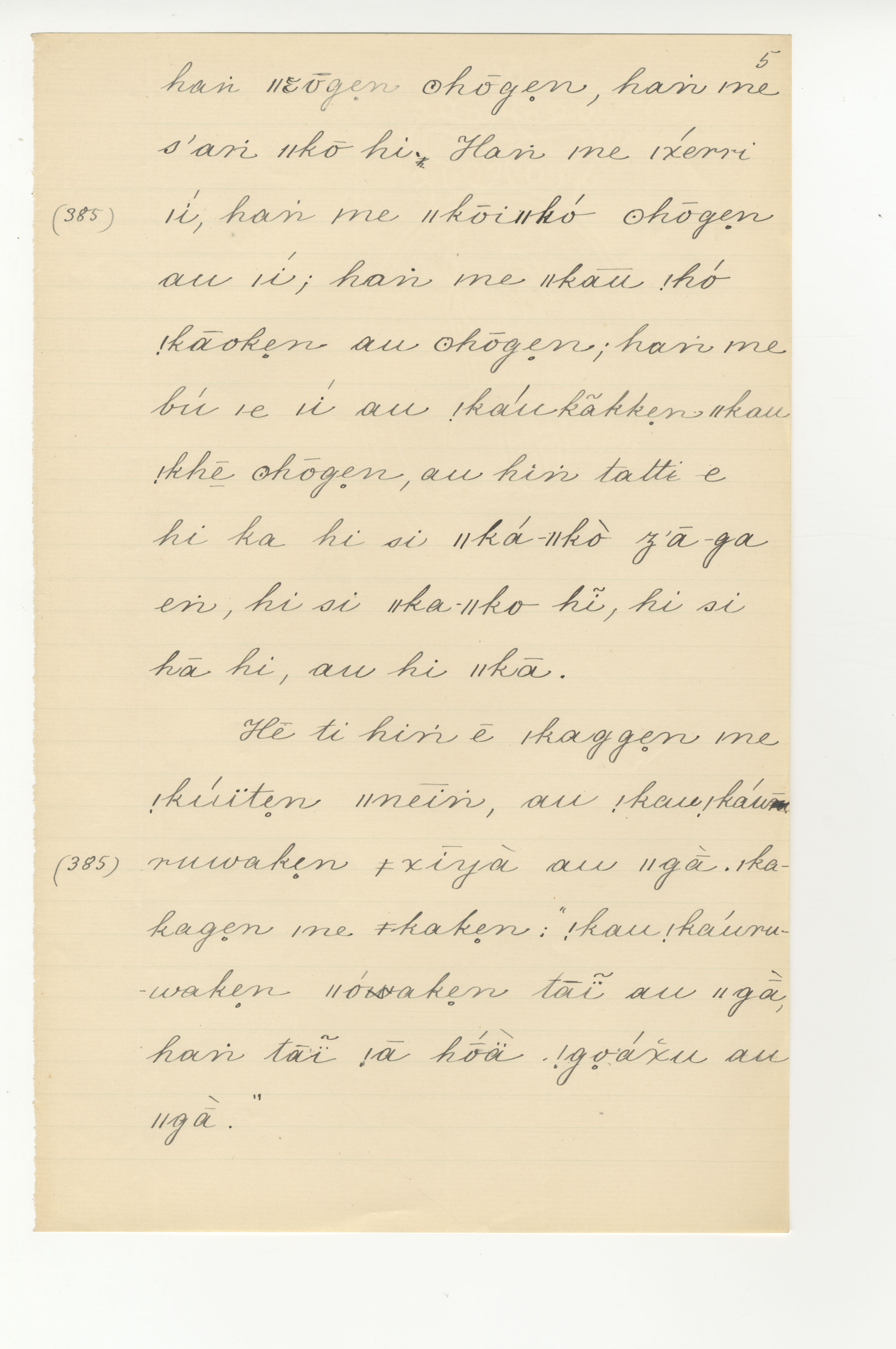 Manuscript page taken from ǁkabbo's story, |kaggen (the Mantis) and the Moon (version 1) -- in Bleek notebook 2 (dated 1871, 1872, 1873 [notes added]), pages (continuing from) 384 to 385 (separated as two paragraphs).