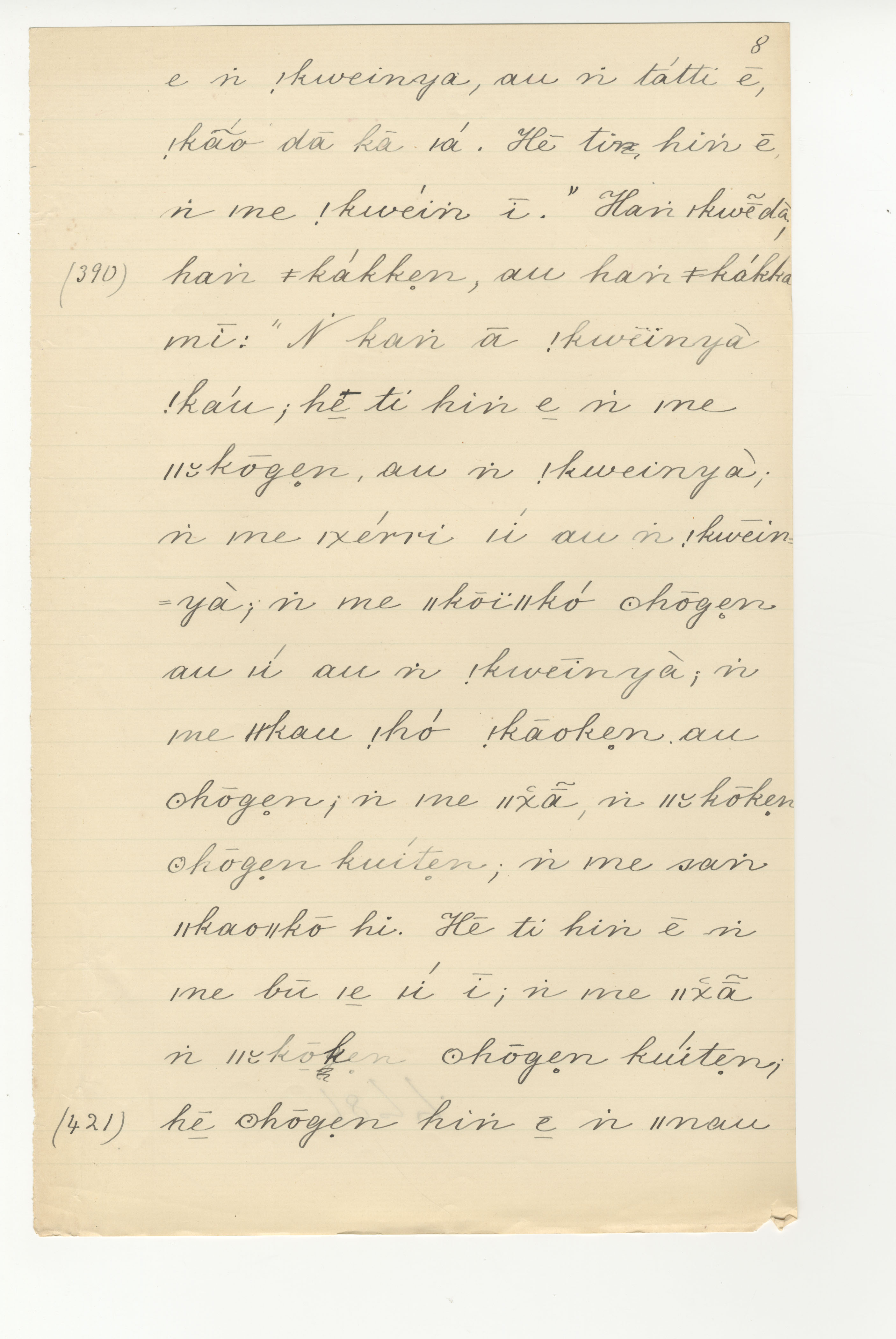 Manuscript page taken from ǁkabbo's story, |kaggen (the Mantis) and the Moon (version 1) -- in Bleek notebook 2 (dated 1871, 1872, 1873 [notes added]), pages (continuing from) 389 to 390, and 421.