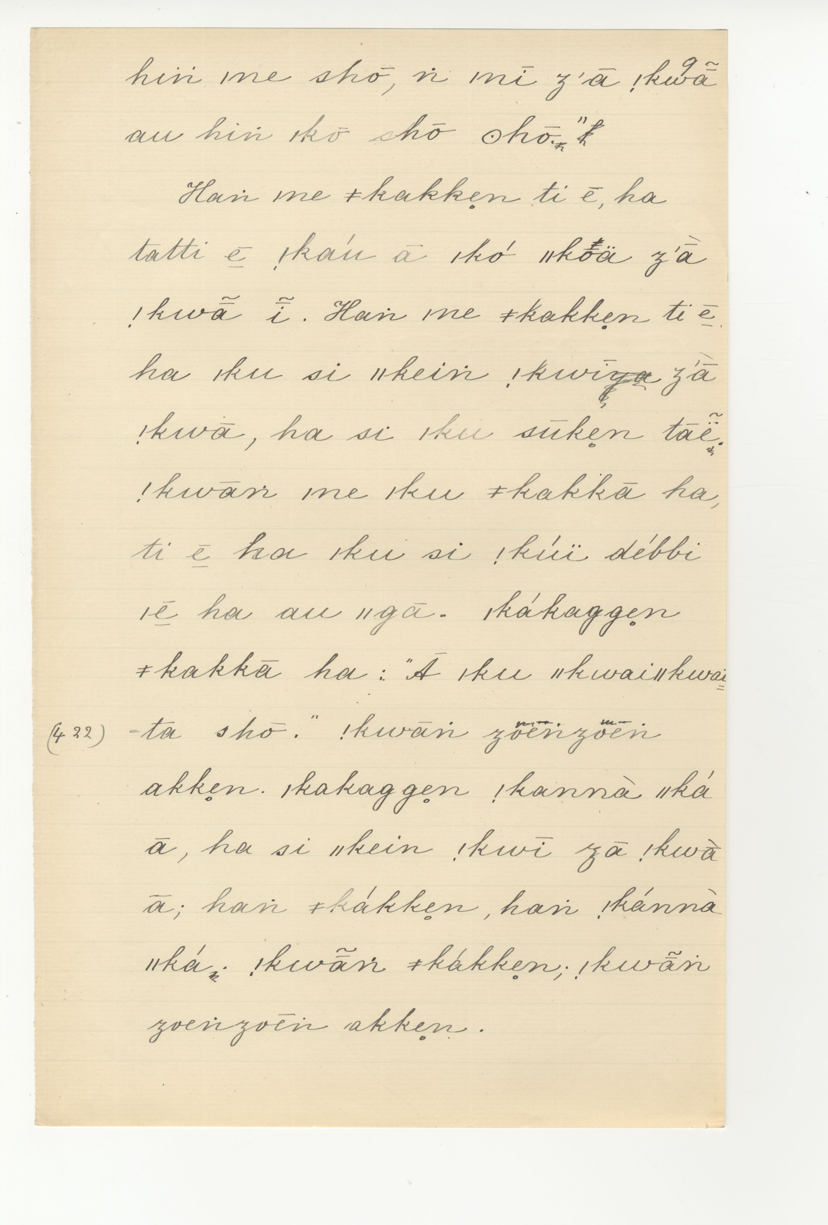 Manuscript page taken from ǁkabbo's story, |kaggen (the Mantis) and the Moon (version 1) -- in Bleek notebook 2 (dated 1871, 1872, 1873 [notes added]), pages (continuing from) 421 to 422.