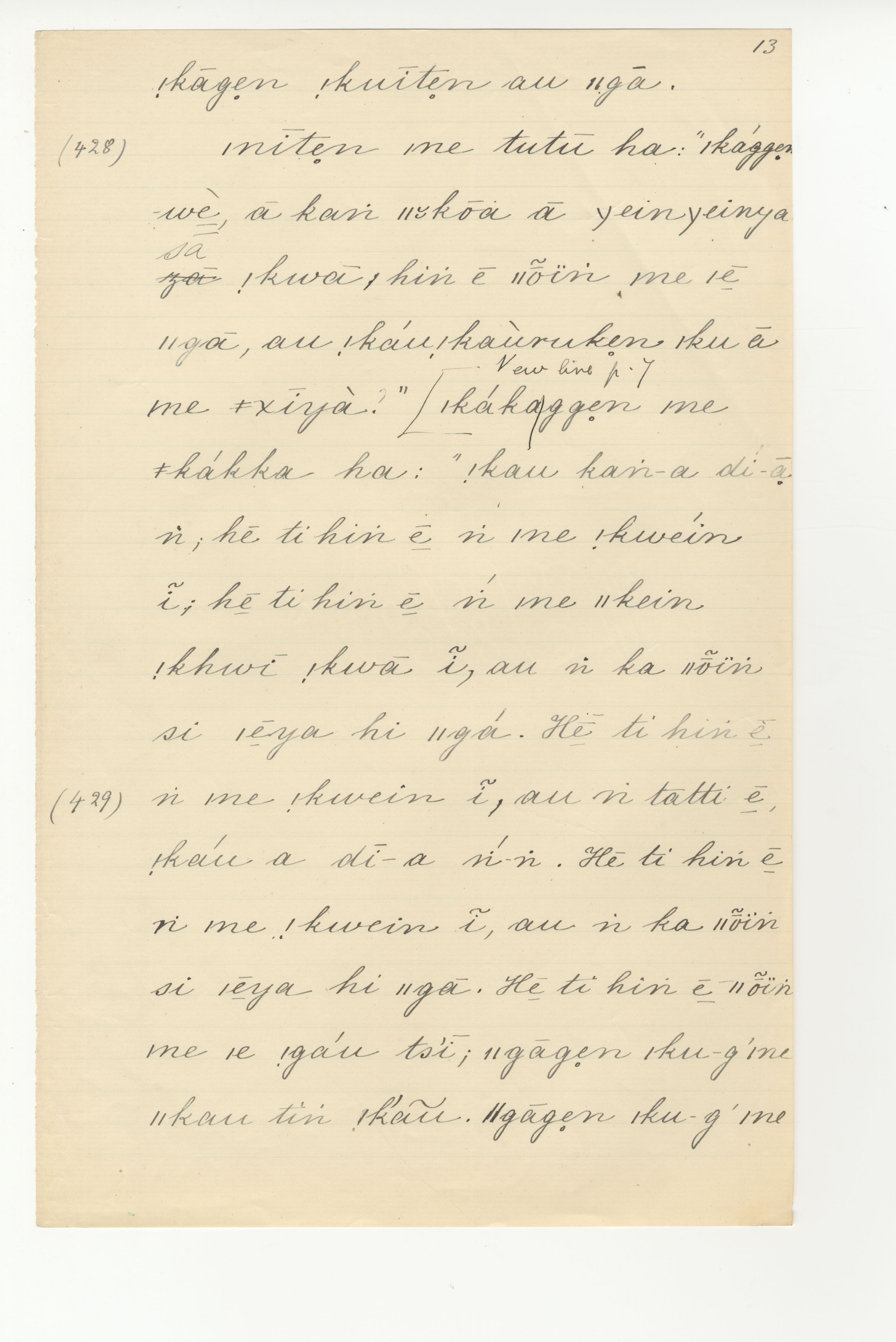 Manuscript page taken from ǁkabbo's story, |kaggen (the Mantis) and the Moon (version 1) -- in Bleek notebooks 2 and 3 (dated 1871, 1872, 1873 [notes added]), pages (continuing from) 427 (B-2) to 429 ([the start of] B-3).